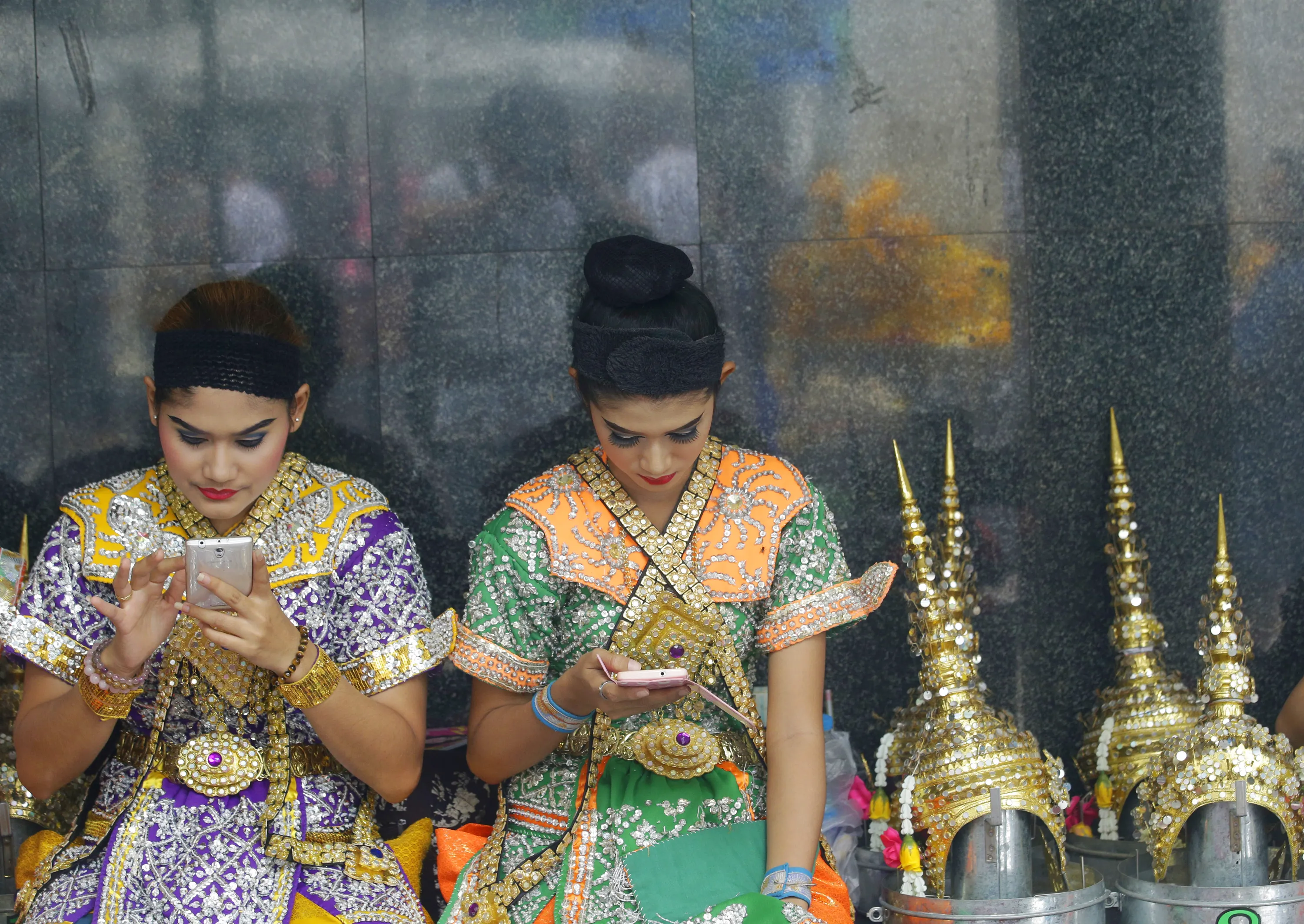 Thai classical dancers, who perform for Phra Phrom, which is the Thai interpretation of the Hindu god Brahma, use their mobile phones at the Erawan Shrine in Bangkok, Thailand, Thursday, September 3, 2015. (Photo by Sakchai Lalit/AP Photo)