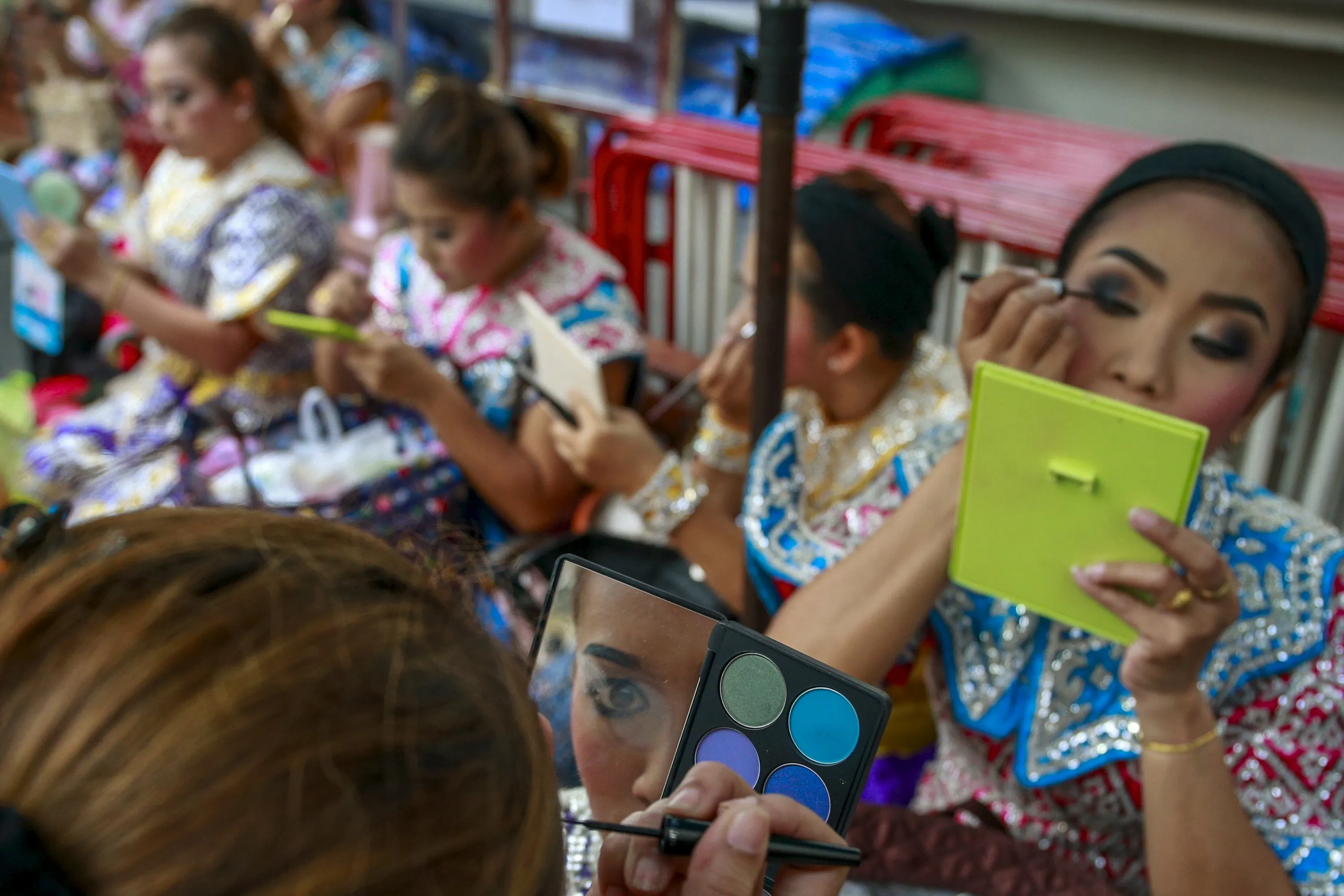 Traditional thai dancers touch up their makeup before a religious ceremony at the Erawan shrine, the site of a recent deadly blast and now repaired, in central Bangkok, Thailand, September 4, 2015. (Photo by Athit Perawongmetha/Reuters)