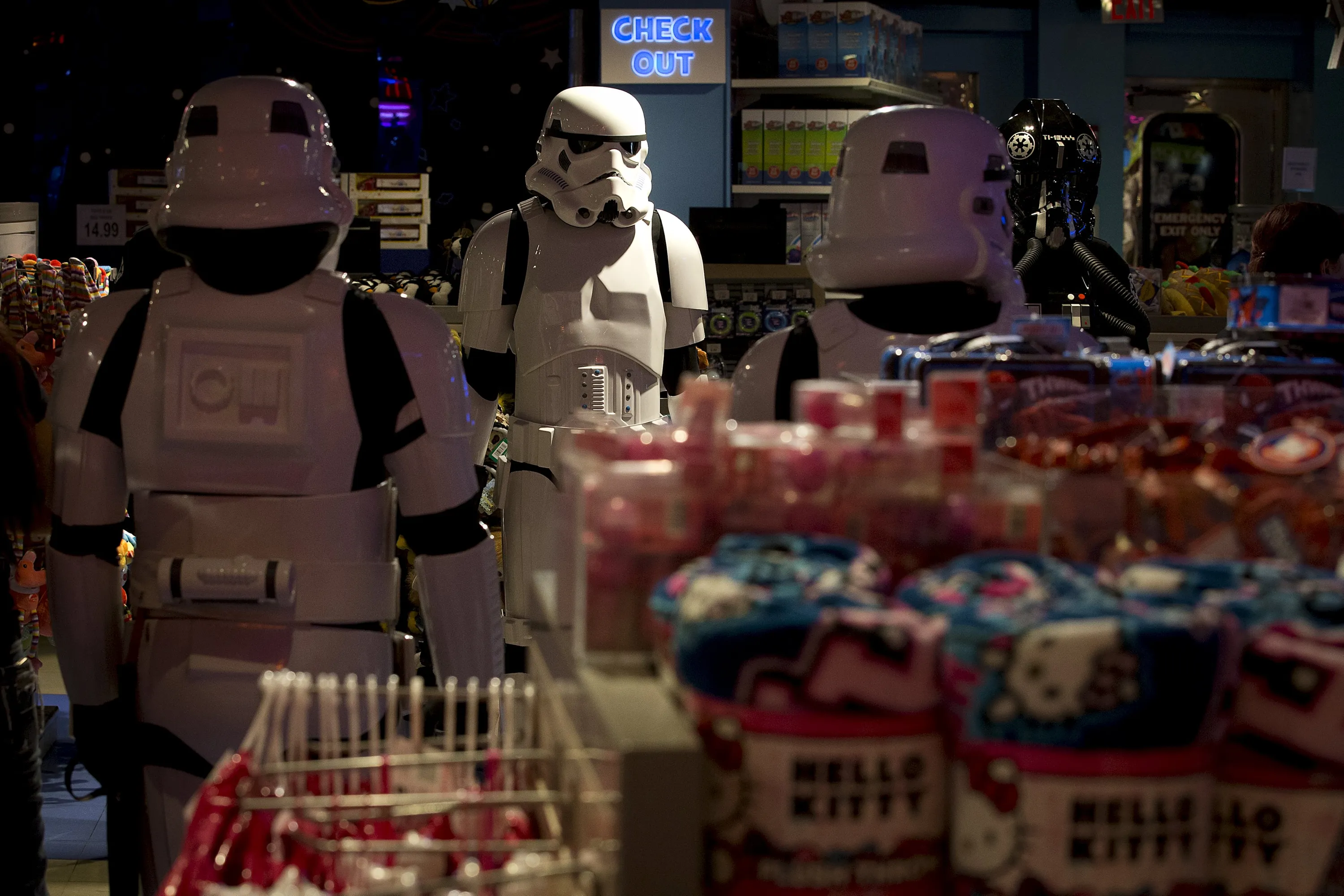 People dressed up as characters from “Star Wars” wait for people to walk in to purchase toys that went on sale at midnight in advance of the film “Star Wars: The Force Awakens” in Times Square in the Manhattan borough of New York, September 4, 2015. (Photo by Carlo Allegri/Reuters)