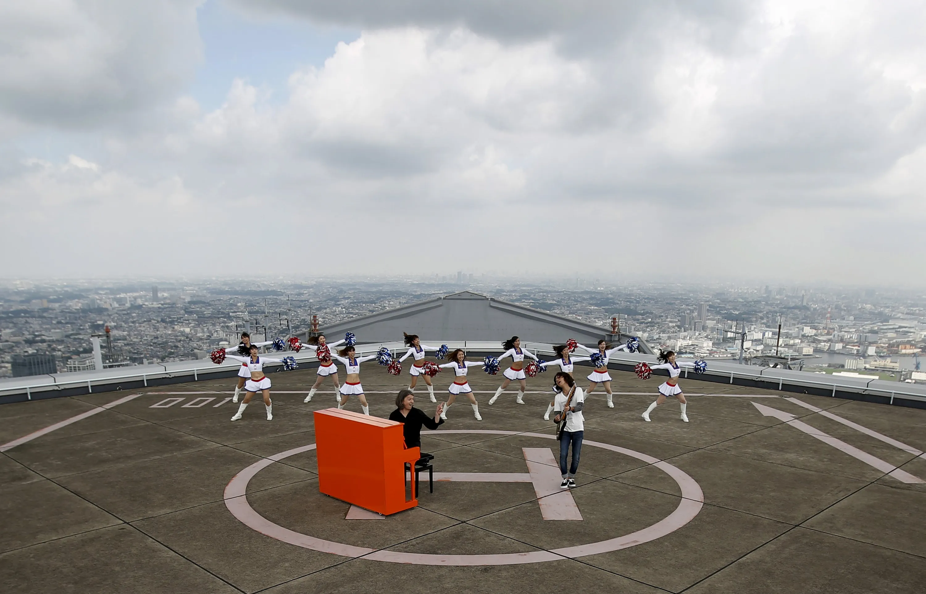 German musician Stefan Aaron plays the piano next to Japanese singer Masahiro (front R) and cheerleaders on top of the Yokohama Landmark Tower, which is 296m high and is the second tallest building in Japan, as part of his Orange Piano Tour in Yokohama, south of Tokyo, Japan, September 4, 2015. (Photo by Yuya Shino/Reuters)