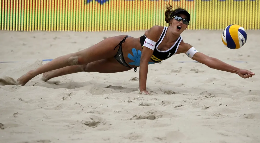 Maria Clara Salgado of Brazil saves a ball against Kerri Walsh and April Ross of the U.S. during their Rio Open women's beach volleyball match on Copacabana beach in Rio de Janeiro, Brazil, September 4, 2015. (Photo by Sergio Moraes/Reuters)