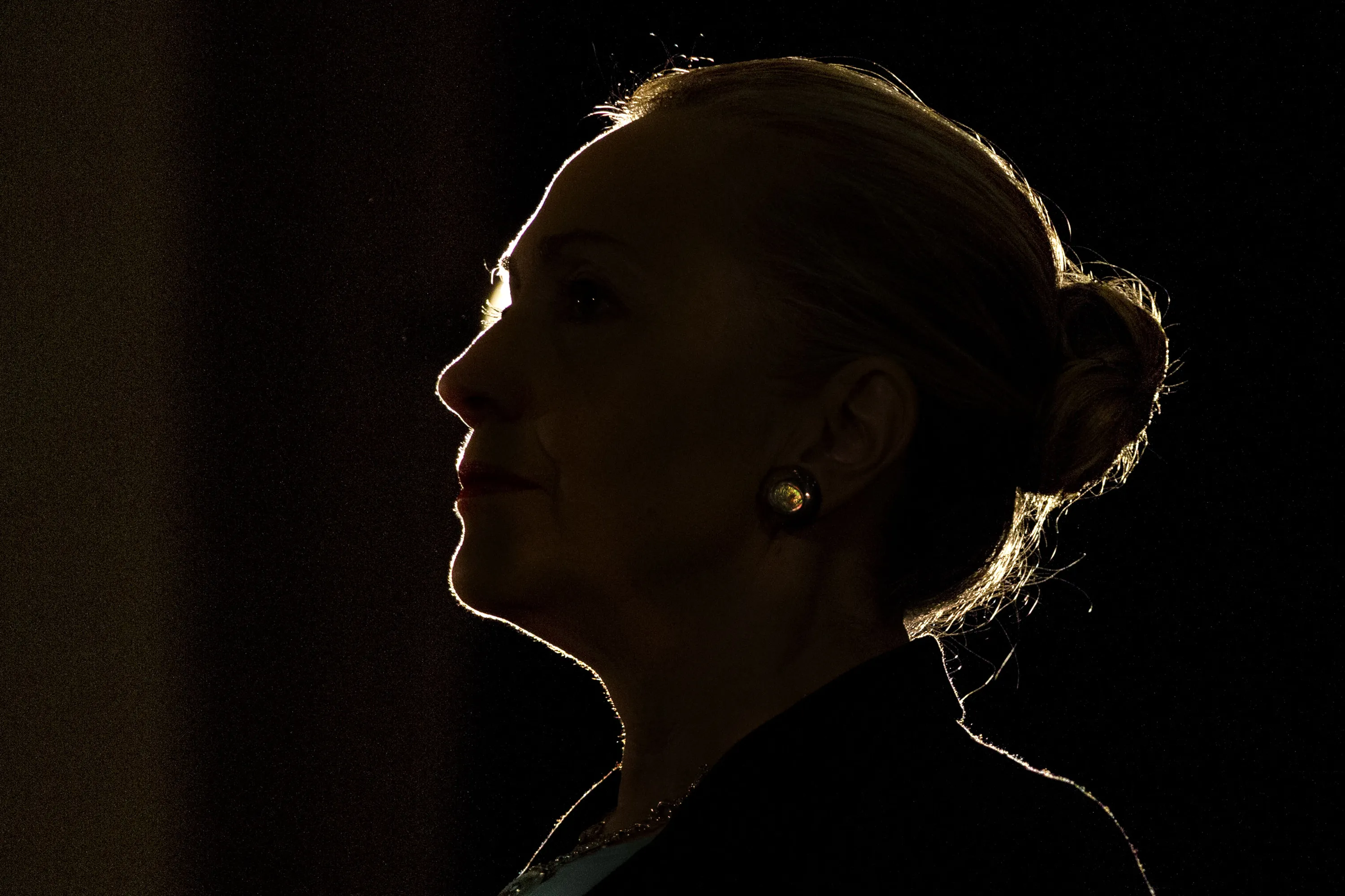 Silhouetted by a stage light, Secretary of State Hillary Rodham Clinton speaks at the University of the Western Cape about U.S.-South Africa partnership, Wednesday, August 8, 2012, in Cape Town, South Africa. (Photo by Jacquelyn Martin/AP Photo)