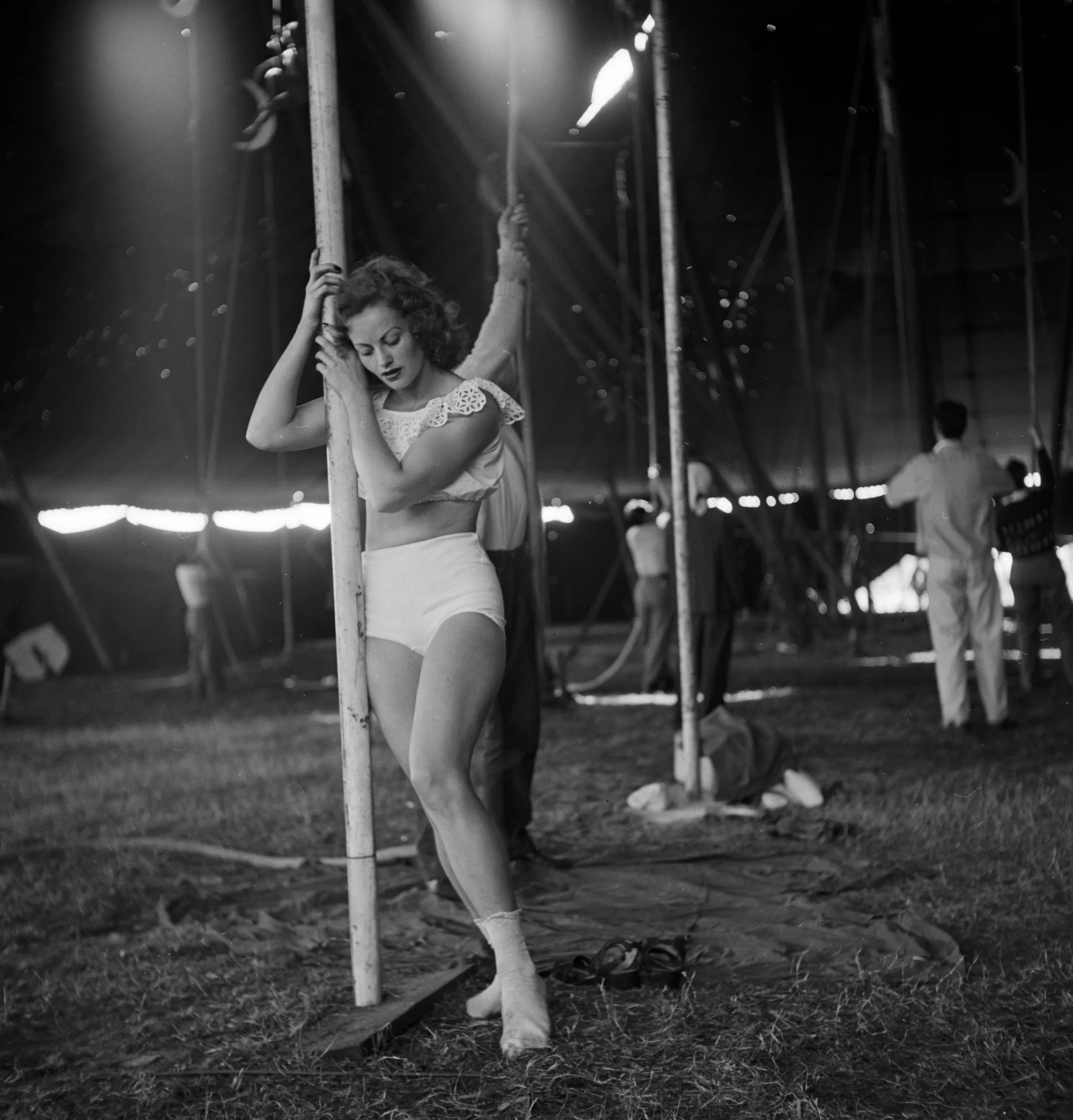 A circus girl standing near a pole while an unidentified man is holding a rope during a rehearsal for the Ringling Bros. and Barnum & Bailey Circus in Sarasota, FL in 1949. (Photo By Nina Leen/Time Life Pictures/Getty Images)
