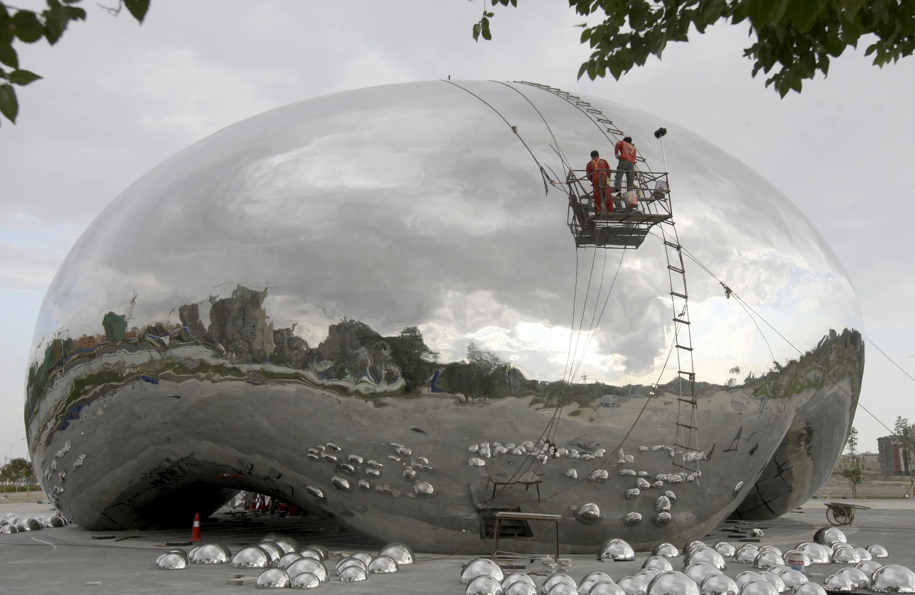 Workers polish a new sculpture in the shape of a giant oil bubble at a tourism resort built near the first drilling well of the Karamay oil field in Xinjiang Uighur Autonomous Region, China, August 9, 2015. The sculpture, consisting of one giant “oil bubble” and many smaller ones, is mostly made of stainless steel and will be finished at the end of August, local media reported. (Photo by Reuters/Stringer)