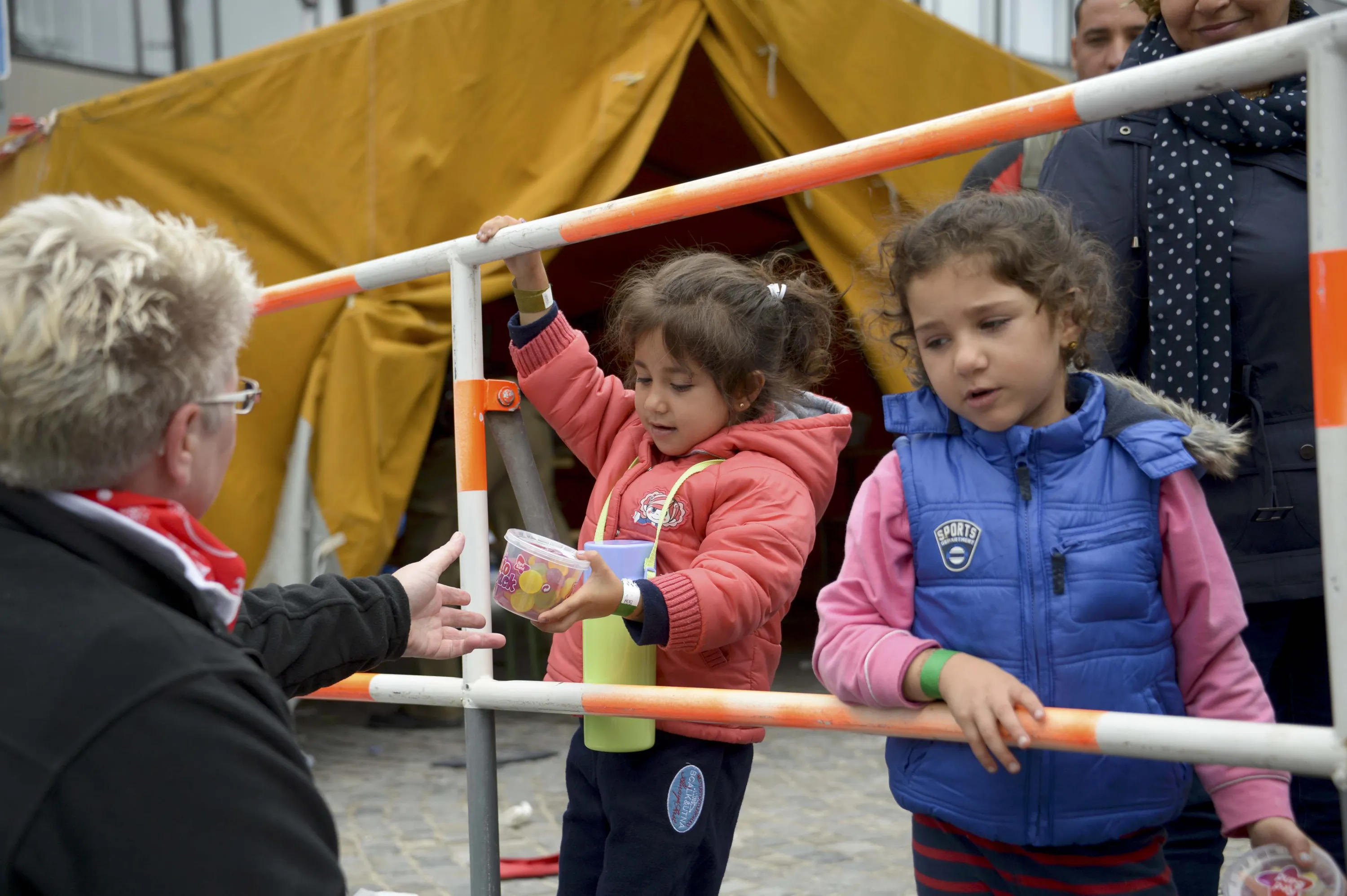 A woman offers candies to children of migrants at a railway station in Munich, Germany September 5, 2015. (Photo by Lukas Barth/Reuters)