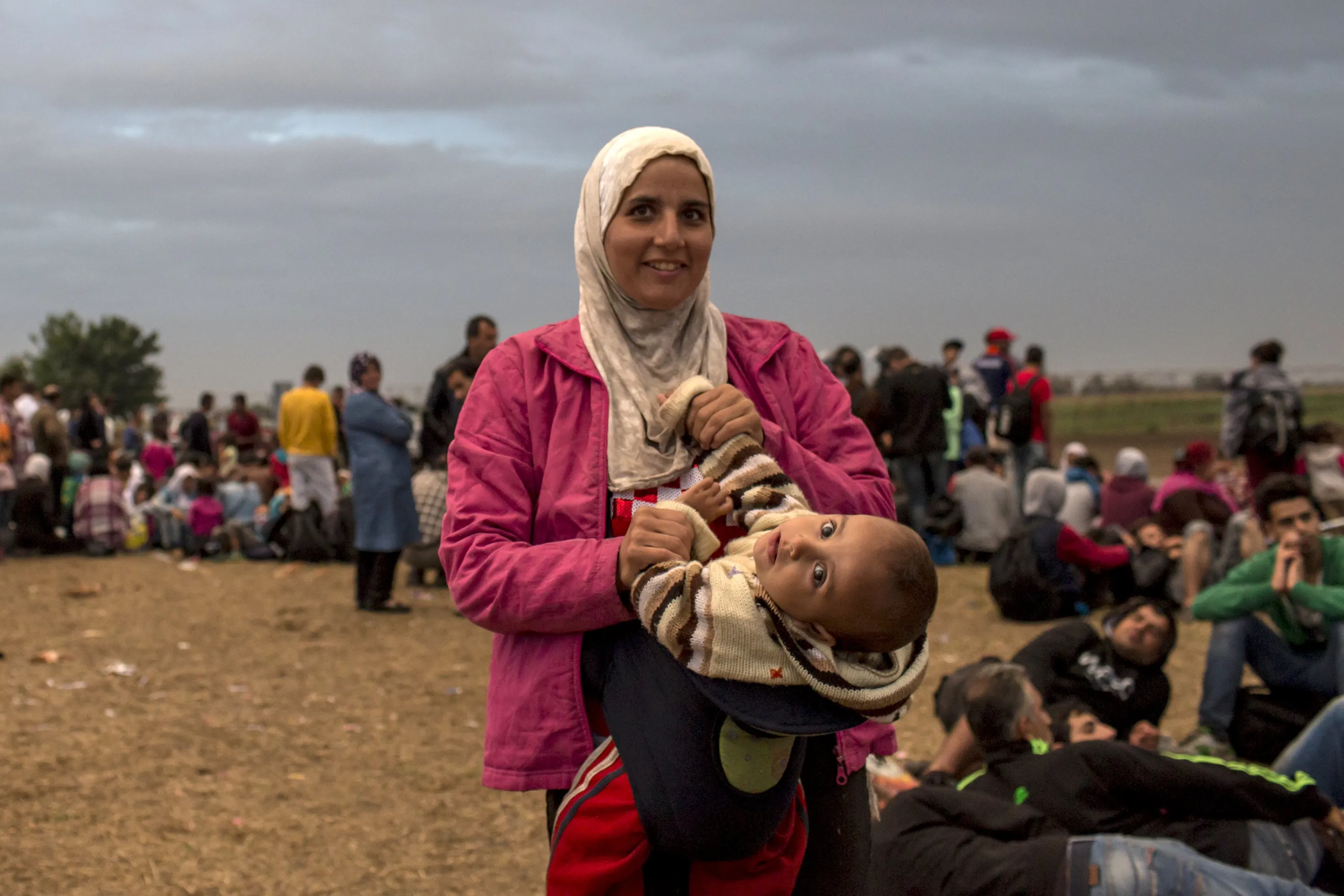 A migrant from Syria holds a child as they wait for a bus after crossing into Hungary from the border with Serbia on a field near the village of Roszke, September 5, 2015. (Photo by Marko Djurica/Reuters)