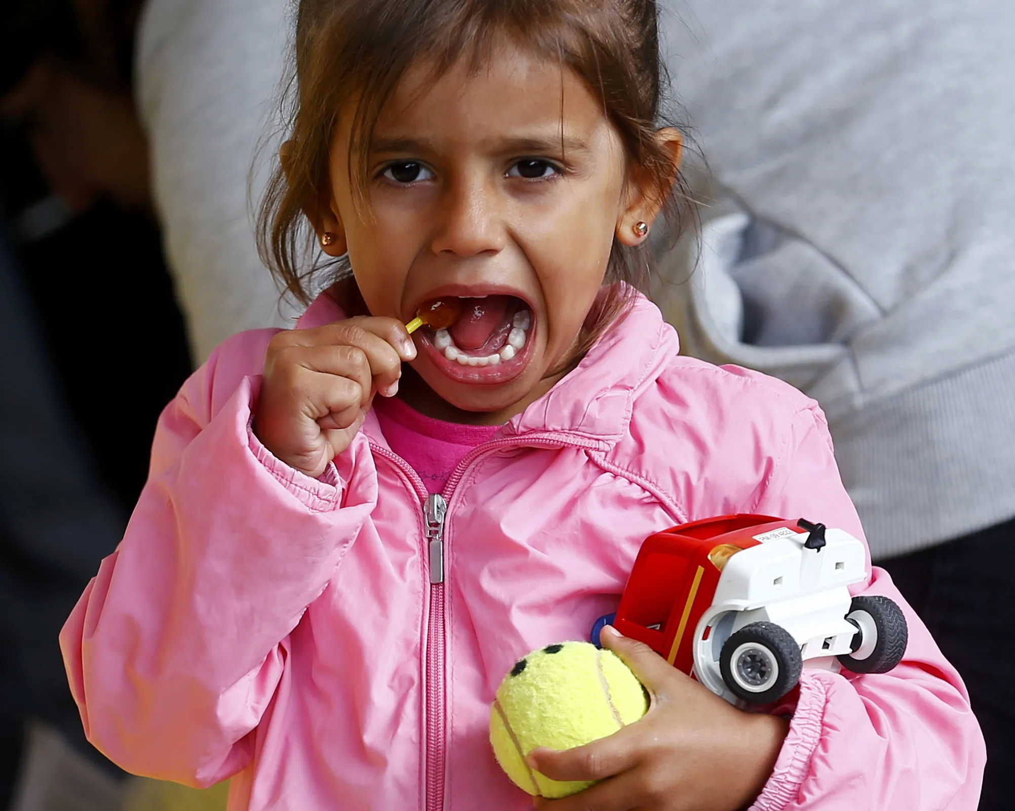 A young migrant girl enjoys a lollypop after arriving at a railway station in Vienna, Austria September 6, 2015. (Photo by Dominic Ebenbichler/Reuters)