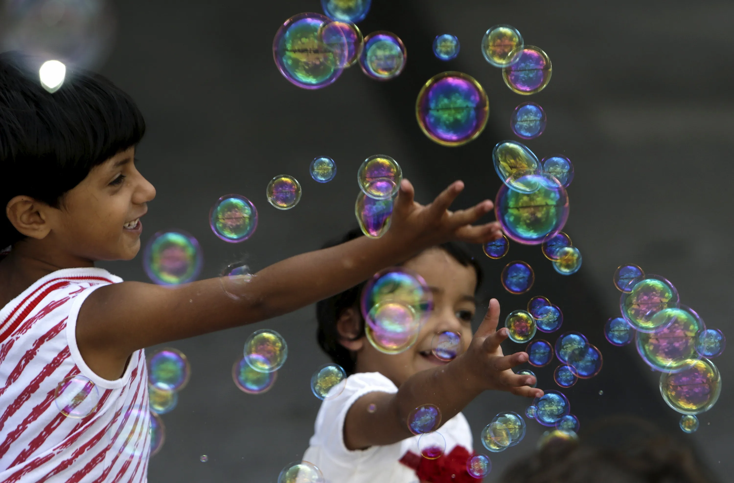 Migrant children play with bubbles at Keleti railway station in Budapest, Hungary, September 6, 2015. (Photo by David W. Cerny/Reuters)