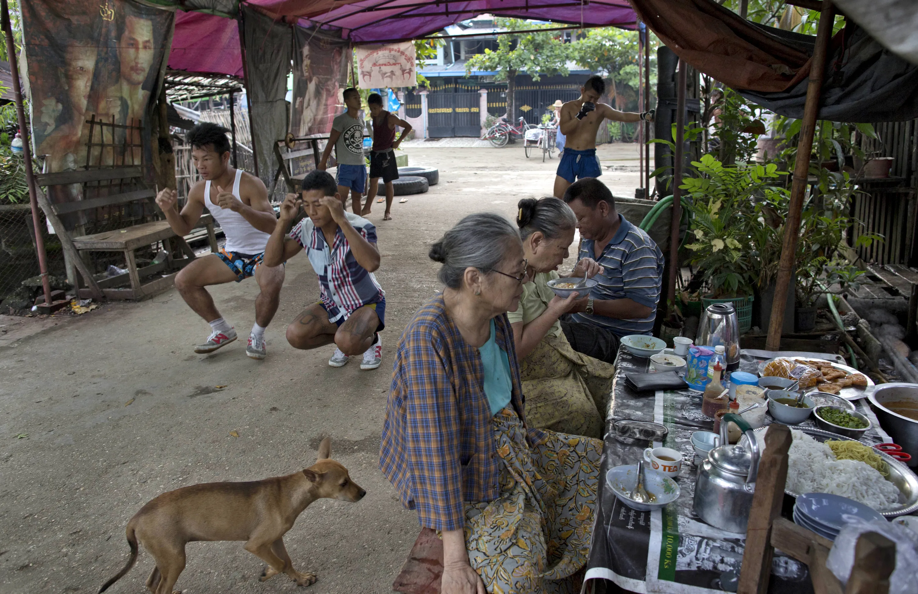 In this Wednesday, July 15, 2015, photo, members of the White New Blood lethwei fighters club, a Myanmar traditional martial-arts club which practices a rough form of kickboxing, warm up in their gym on a street as customers eat a meal at a roadside noodles shop in Oakalarpa, north of Yangon, Myanmar. (Photo by Gemunu Amarasinghe/AP Photo)