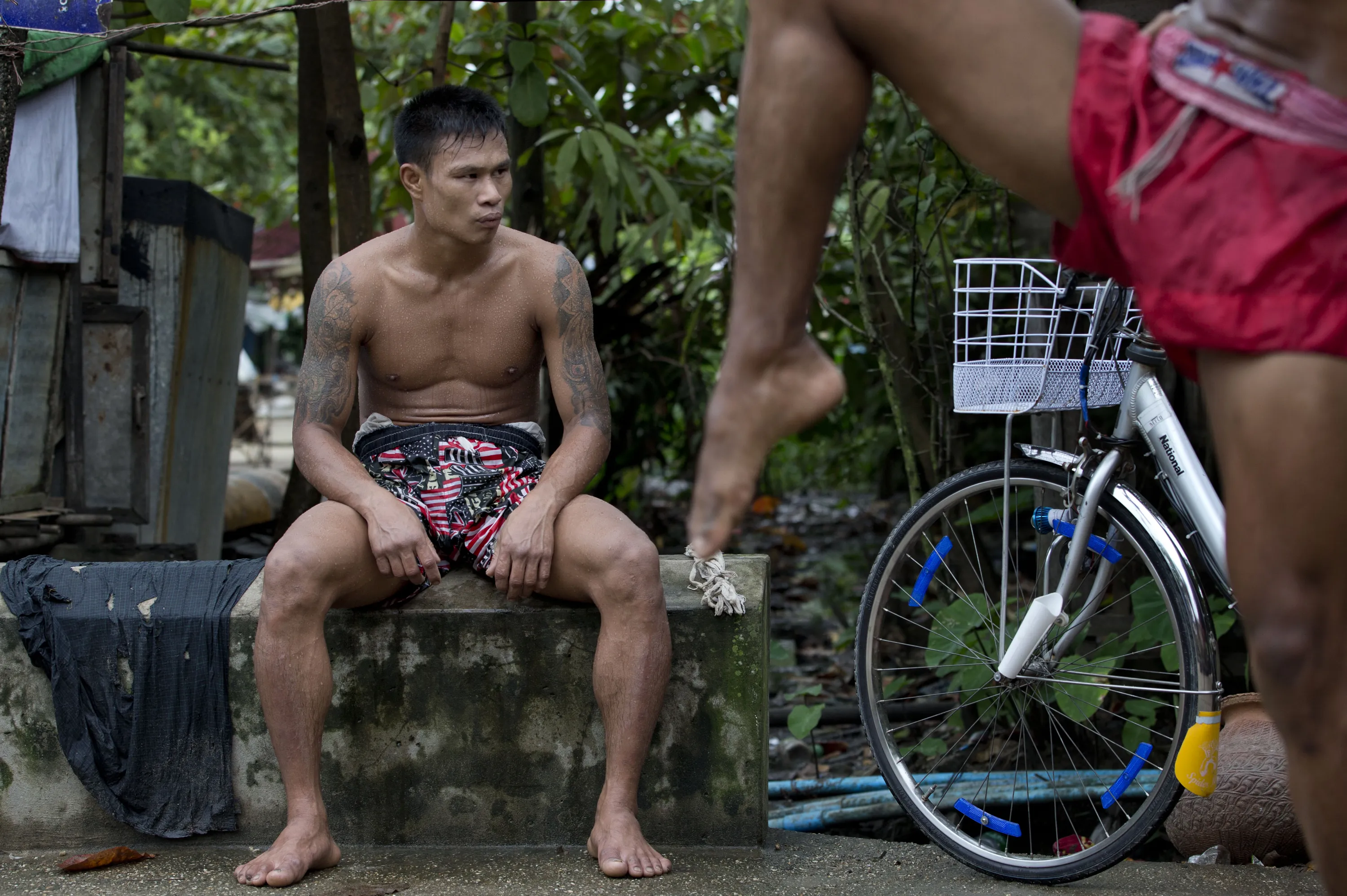 In this Tuesday, July 14, 2015, photo, a member of the White New Blood lethwei fighters club, a Myanmar traditional martial-arts club which practices a rough form of kickboxing, sits during a practice session in their gym on a street in Oakalarpa, north of Yangon, Myanmar. (Photo by Gemunu Amarasinghe/AP Photo)