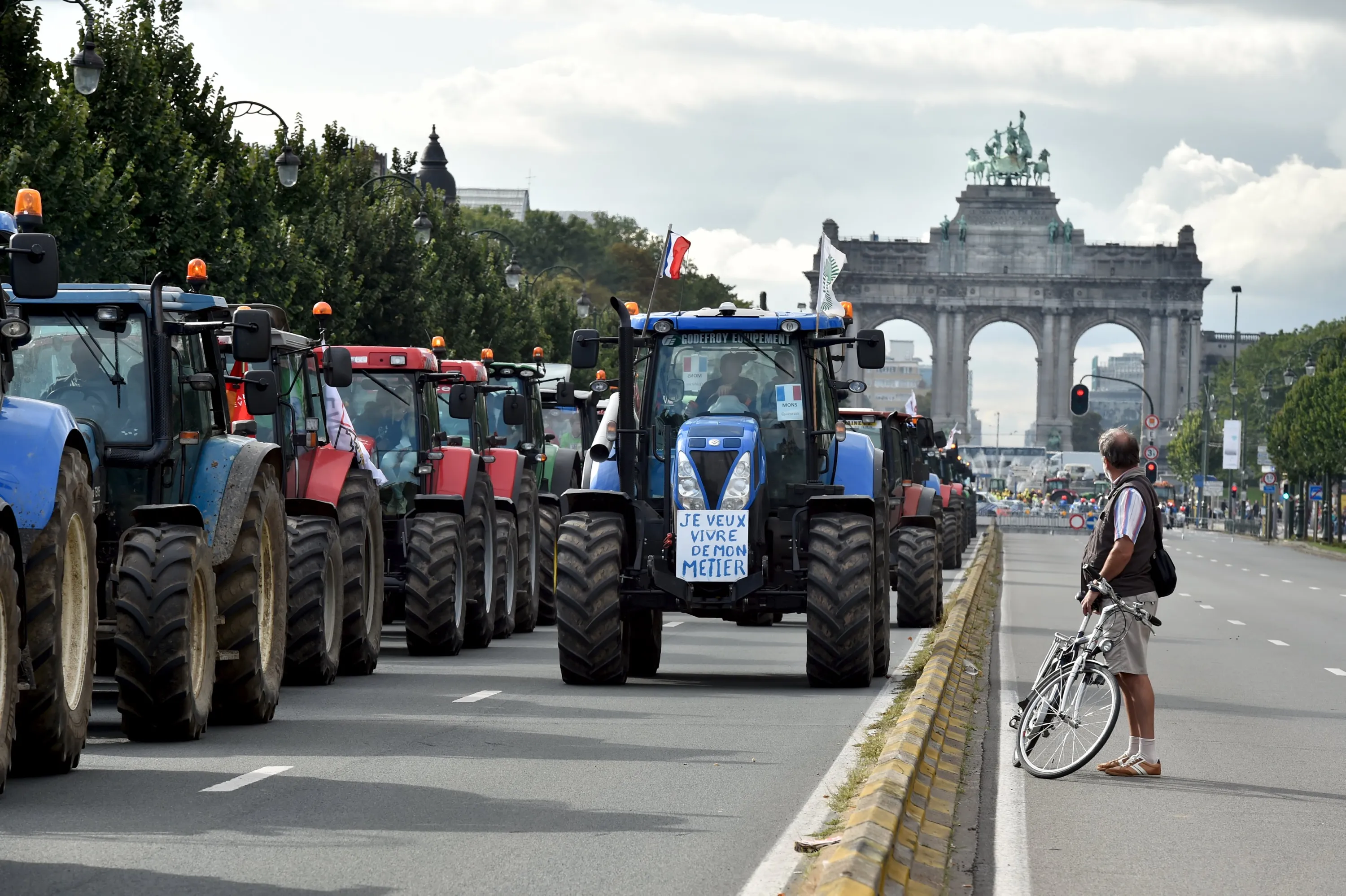 A cyclist looks at tractors in central Brussels as farmers and dairy farmers from all over Europe take part in a demonstration outside a European Union farm ministers' emergency meeting at the EU Council headquarters in Brussels, Belgium September 7, 2015. (Photo by Eric Vidal/Reuters)