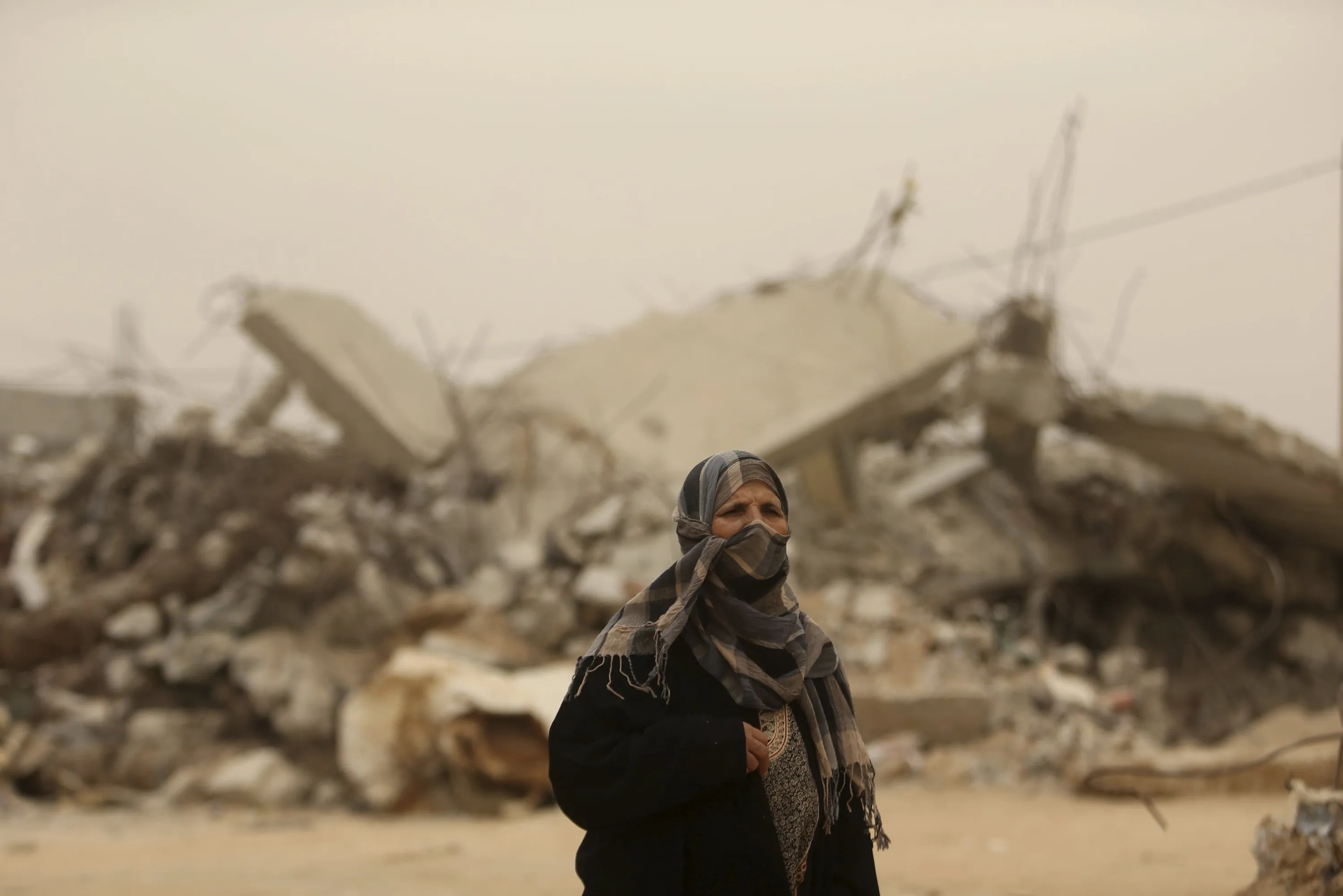 A Palestinian woman looks on as she stands in front of the ruins of a house, that witnesses said was destroyed by Israeli shelling during a 50-day war in 2014 summer, during a sandstorm in Khan Younis in the southern Gaza Strip September 8, 2015. (Photo by Ibraheem Abu Mustafa/Reuters)