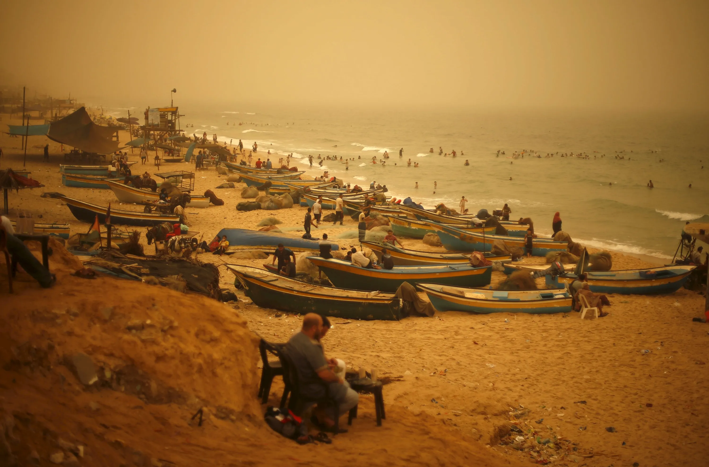 Palestinians sit on a beach along the Mediterranean Sea during a sandstorm in the northern Gaza Strip September 8, 2015. (Photo by Mohammed Salem/Reuters)