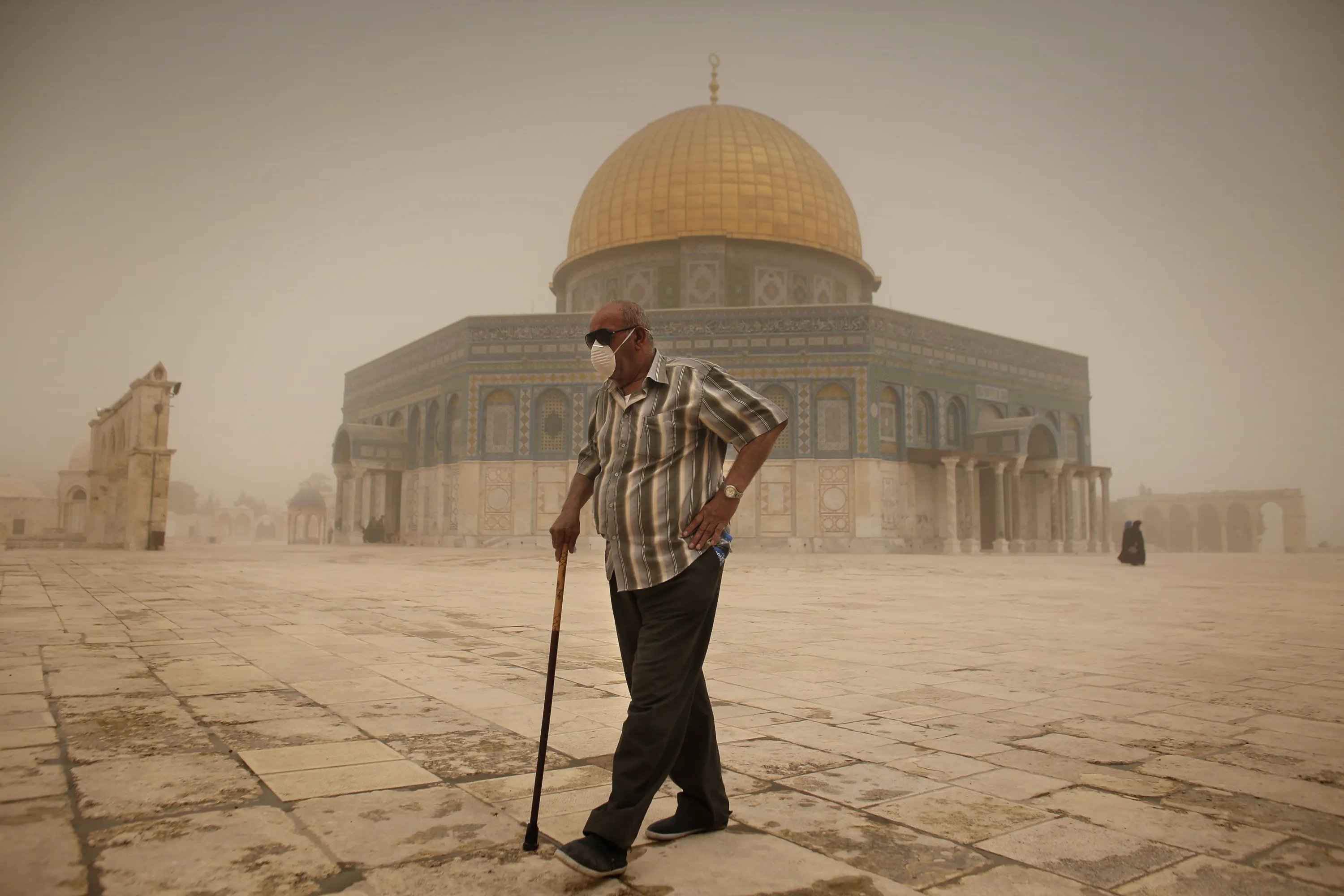 A Palestinian man wears a mask to protect his face from the dust as he walks past the Dome of the Rock mosque in the al-Aqsa Mosque compound, during a sandstorm on September 8, 2015, in the old city of Jerusalem. A massive sandstorm has blanketed much of the Middle East. Large parts of Lebanon, Israel and Cyprus were shrounded in a thick cloud of dust that meteorologists said had swept in from Iraq and Syria. (Photo by Ahmad Gharabli/AFP Photo)