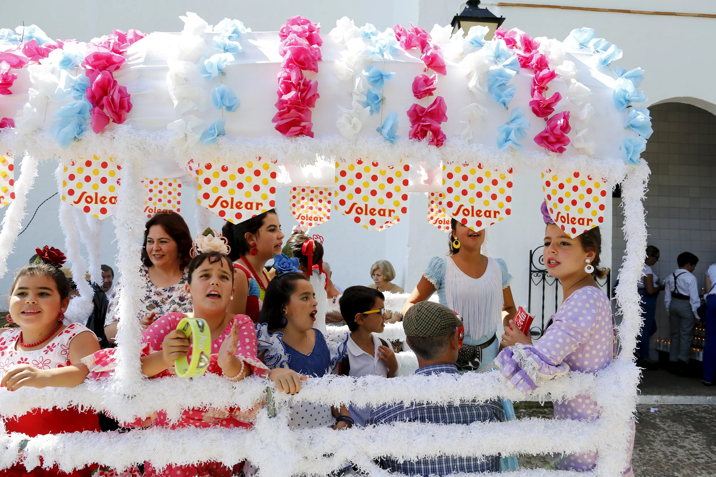 Pilgrims wearing traditional dresses sing on a carriage during the Queen of Angeles pilgrimage in Alajar, southern Spain, September 8, 2015. Every year, devotees converge at the Arias Montano crag to pay homage to the Queen of Angeles during an annual pilgrimage which combines religious fervour and festive colour. (Photo by Marcelo del Pozo/Reuters)