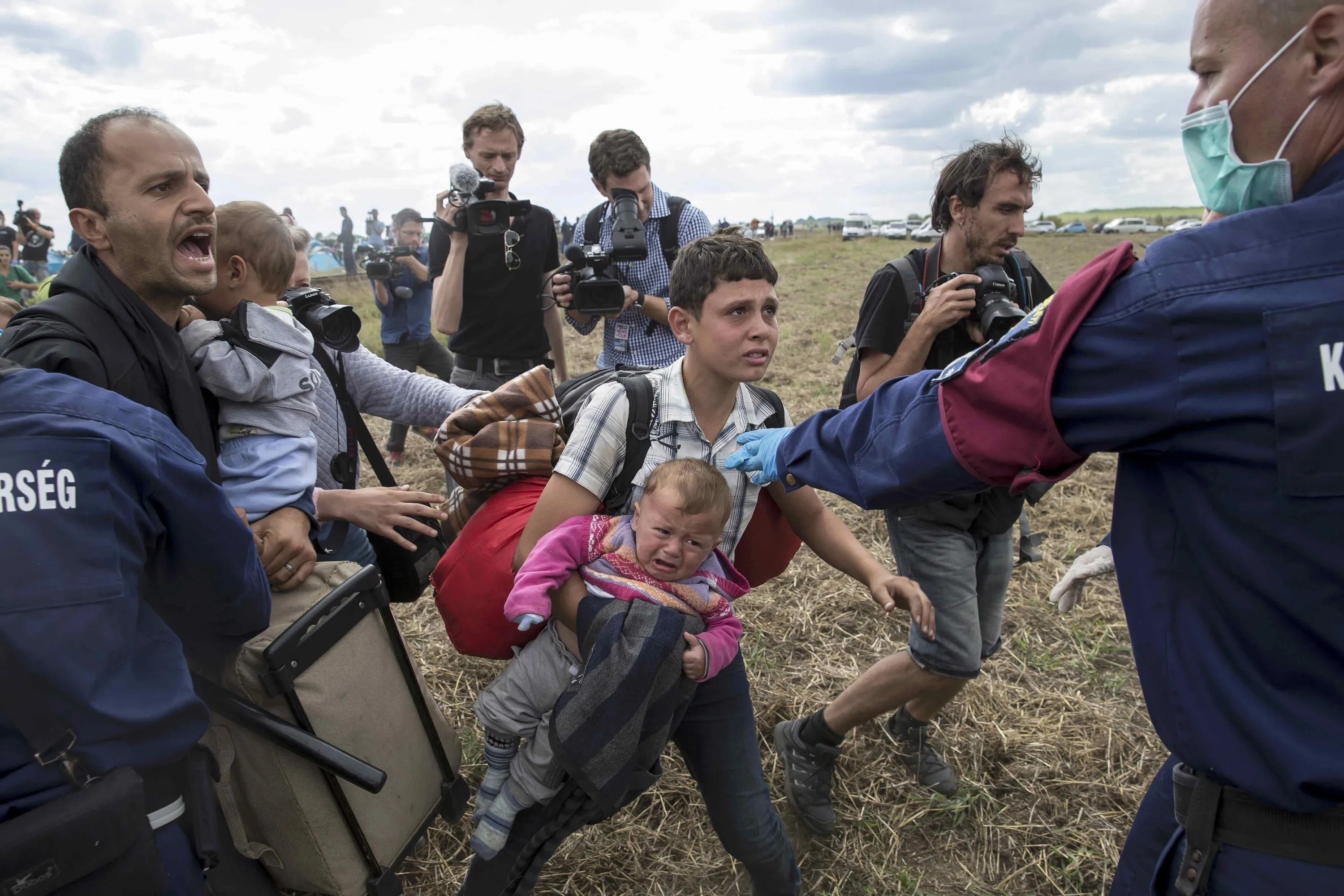 A migrant carrying a baby is stopped by a Hungarian policeman as he tries to escape a collection point in Roszke village, Hungary, September 8, 2015. (Photo by Marko Djurica/Reuters)