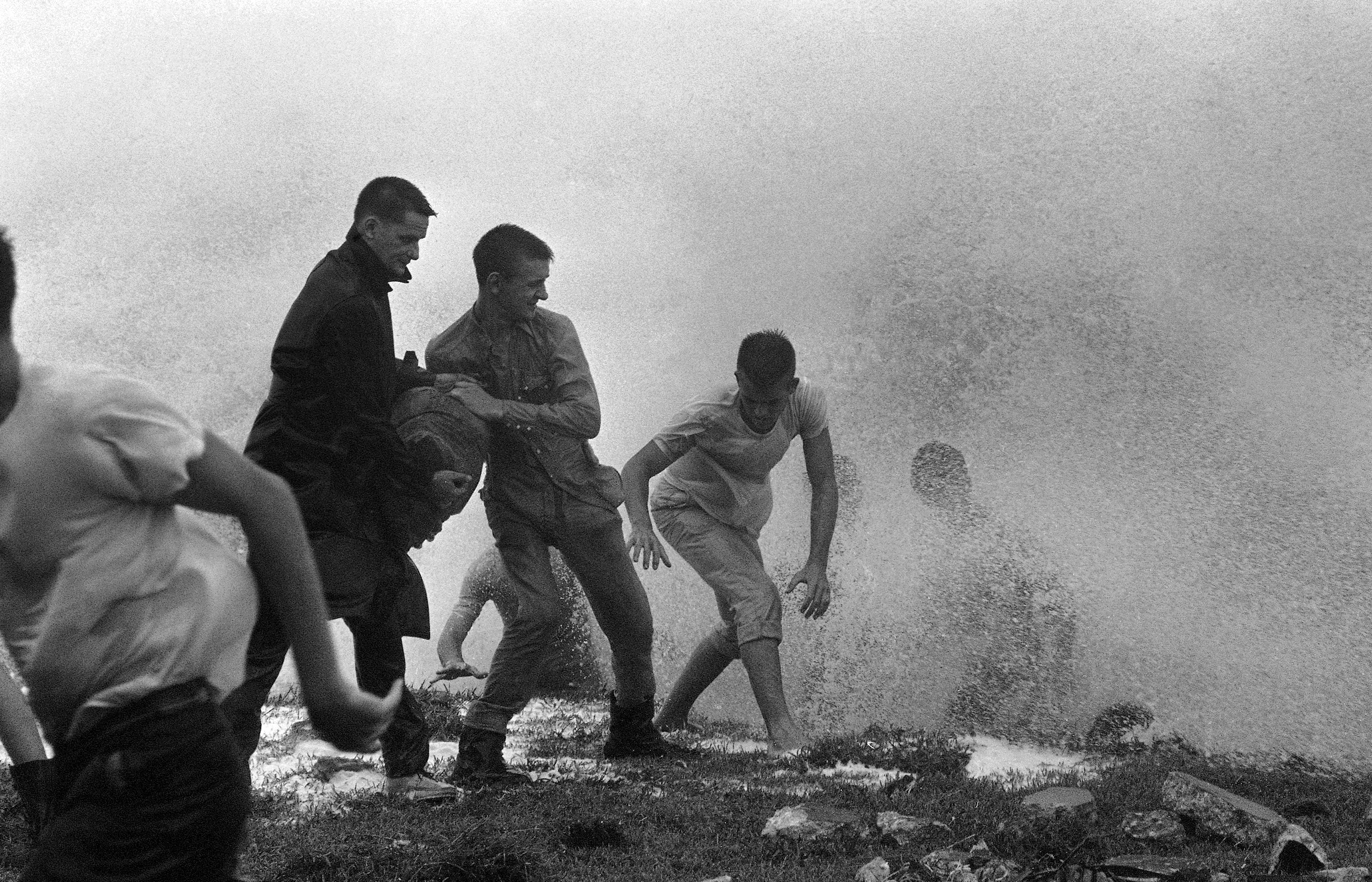 A group of volunteer's passes sandbags and duck sea spray in an effort to save a seawall at Jacksonville Beach on September 9, 1964 as the heavy seas and wind eat at the shore line. High seas have lashed the Florida coast and caused heavy damage to homes and power lines. (Photo by AP Photo)
