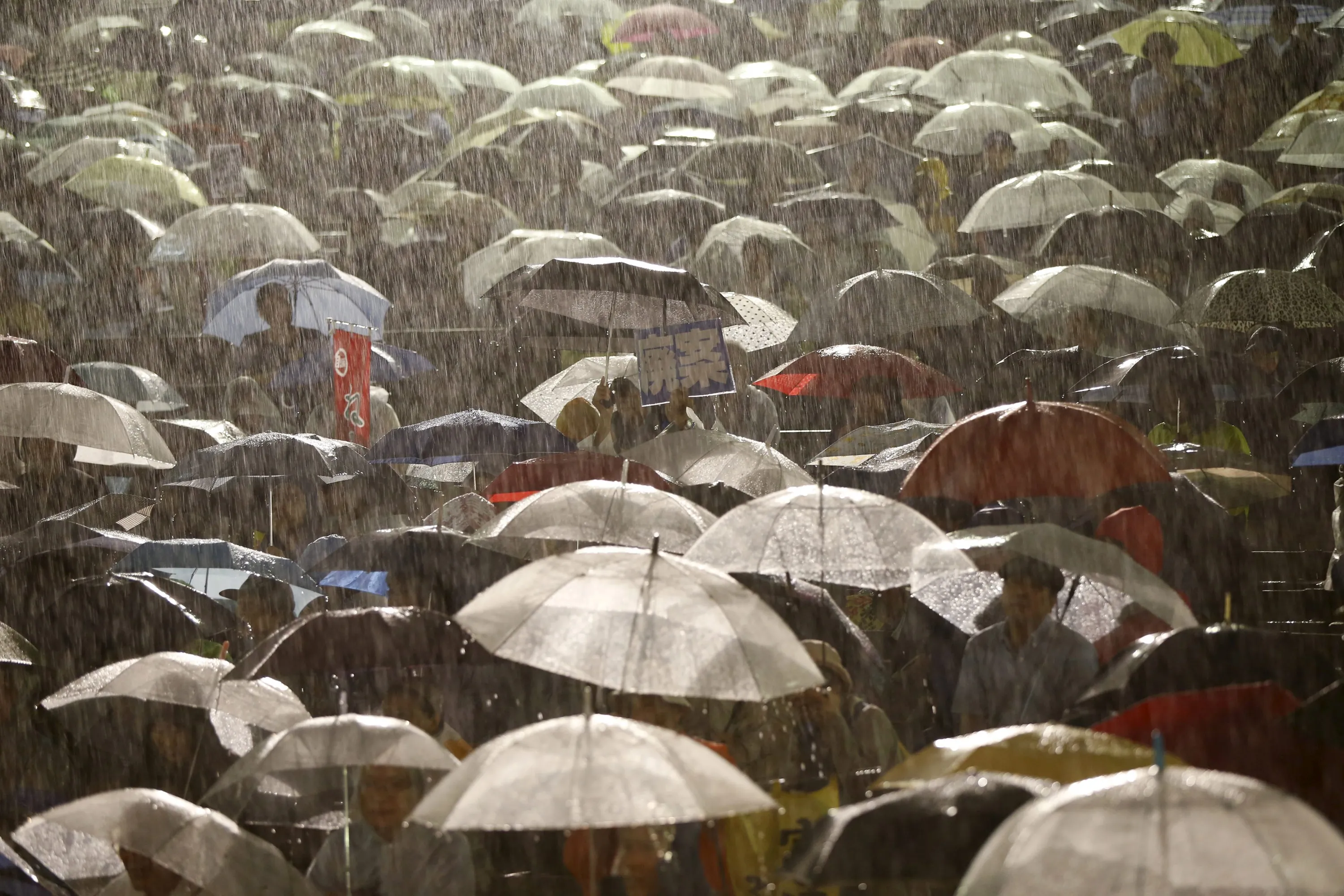 Protesters holding umbrellas gather at a rally against Japan's Prime Minister Shinzo Abe's security bill and his administration, during heavy rain caused by typhoon Etau, in Tokyo September 9, 2015. (Photo by Issei Kato/Reuters)