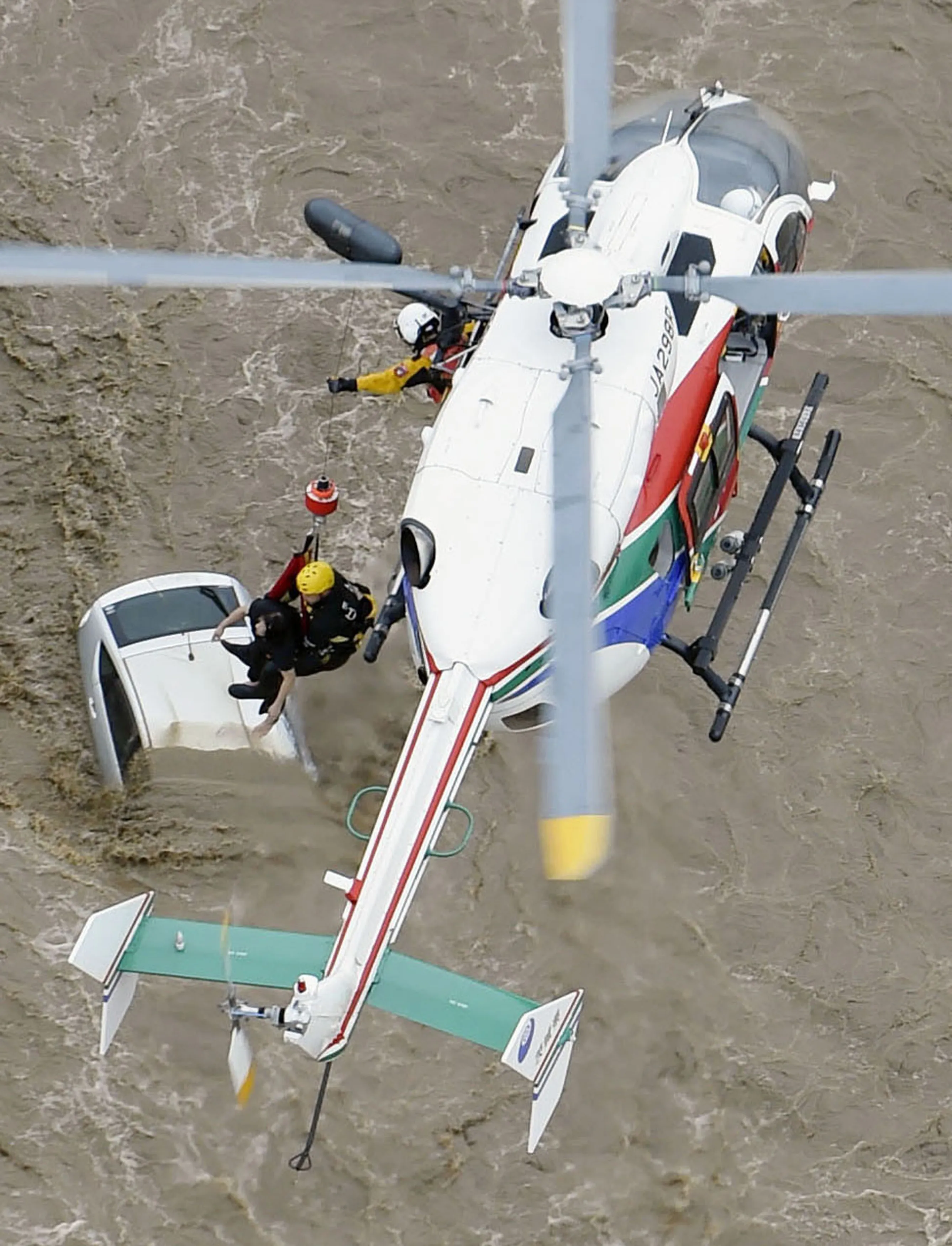 A resident is rescued from a flooded residential area in Joso, Ibaraki prefecture, northeast of Tokyo Thursday, September 10, 2015. (Photo by Kyodo News via AP Photo)