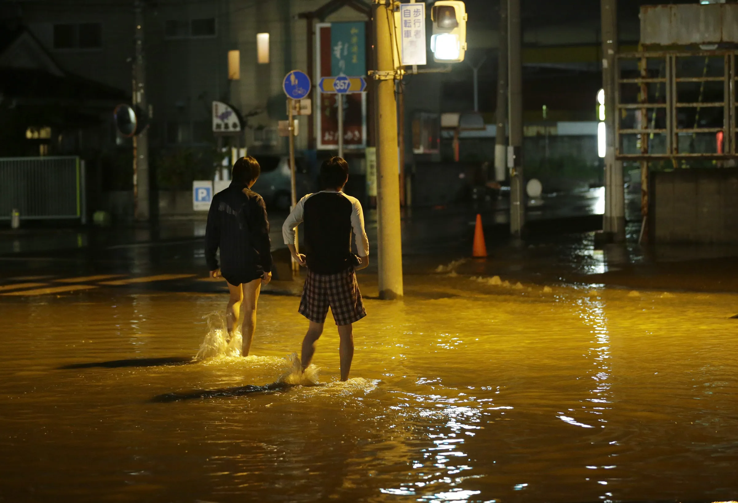 People walk through a flooded street in Joso, Ibaraki prefecture, north of Tokyo, Thursday, September 10, 2015. Raging floodwaters broke through a flood berm Thursday and swamped the city north of Tokyo, washing away houses, forcing dozens of people to rooftops to await helicopter rescues. (Photo by Shizuo Kambayashi/AP Photo)