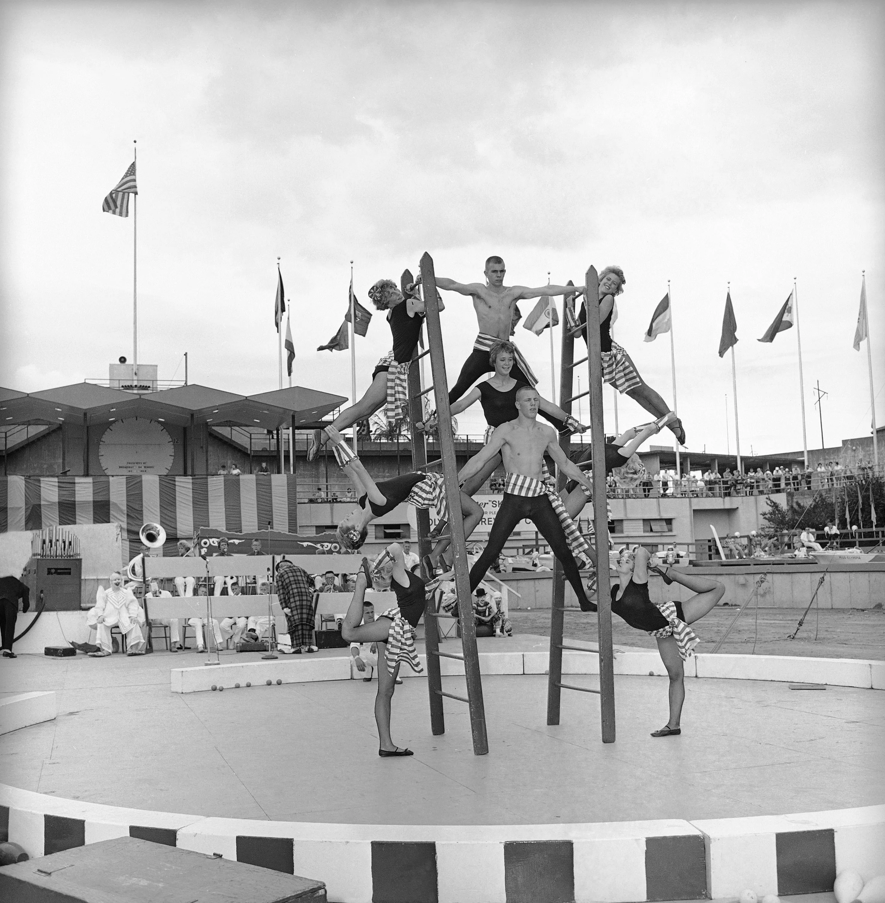 An unusual amateur circus, the Wenatchee Youth Circus, climaxed its summer tour in performances at the World's Fair in Seattle, Washington on September 10, 1962. The circus, known around the Northwest as “The Greatest Little Show on Earth”, comes from Wenatchee, Wash. Its 75 troupers range from 3 to 18 years old. The troupe is directed by Dennis Miller, 16 (top center). (Photo by Ed Johnson/AP Photo)