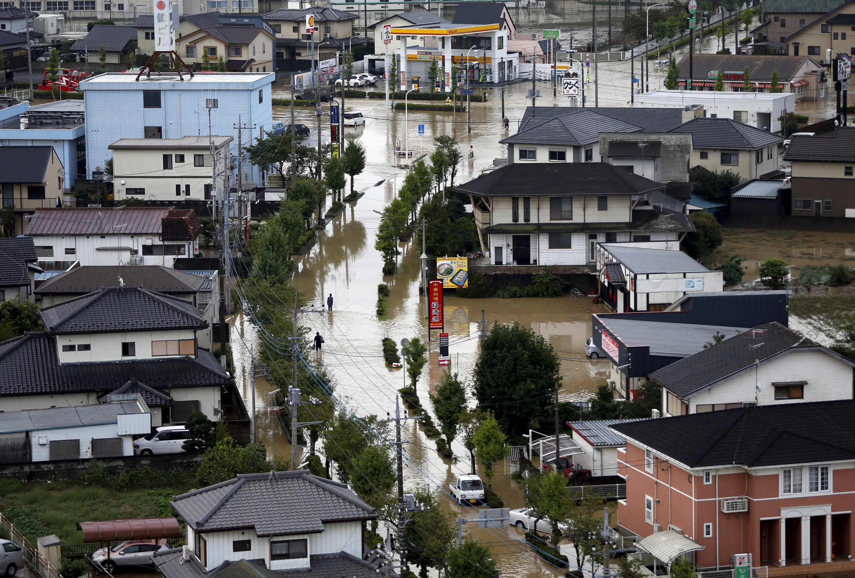 Local residents wade through a residential area flooded by the Kinugawa river, caused by typhoon Etau, in Joso, Ibaraki prefecture, Japan, September 11, 2015. (Photo by Issei Kato/Reuters)