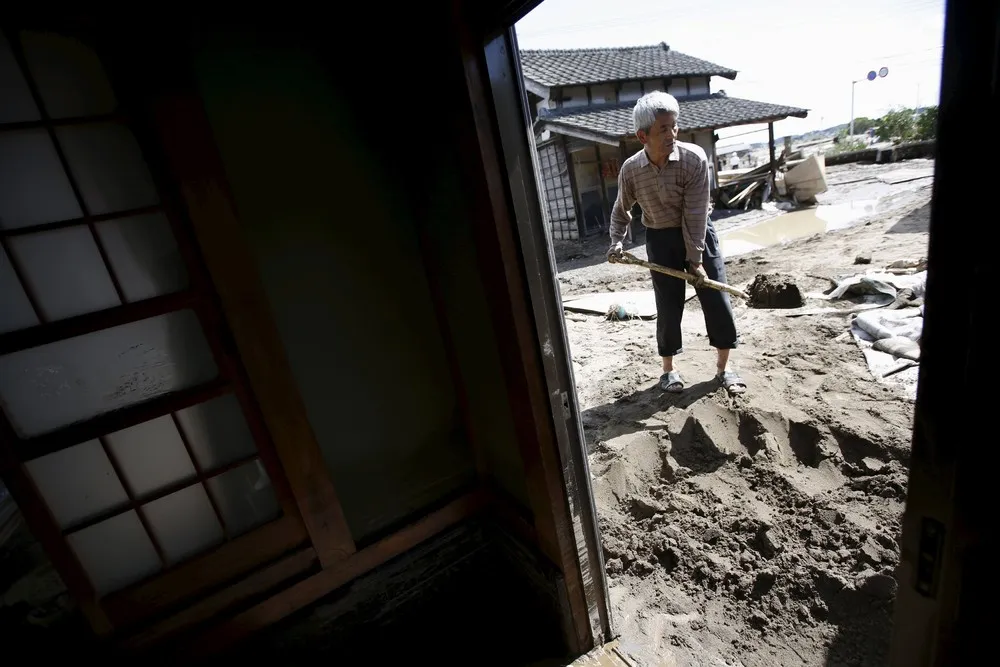 Local resident Toshiichi Nakazawa, 75, removes mud and debris around the entrance of his house at a residential area flooded by the Kinugawa river, caused by typhoon Etau, in Joso, Ibaraki prefecture, Japan, September 11, 2015. (Photo by Issei Kato/Reuters)