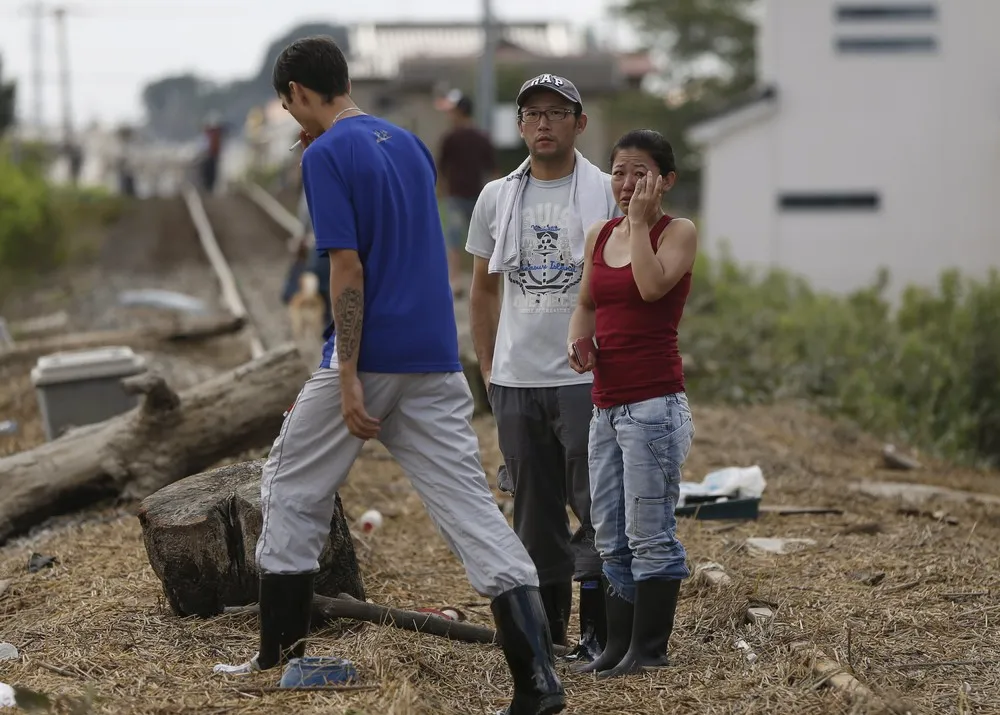 A woman cries as she looks at her damaged house at a residential area flooded by the Kinugawa river, caused by typhoon Etau, at Mitsukaido district in Joso, Ibaraki prefecture, Japan, September 12, 2015. (Photo by Issei Kato/Reuters)