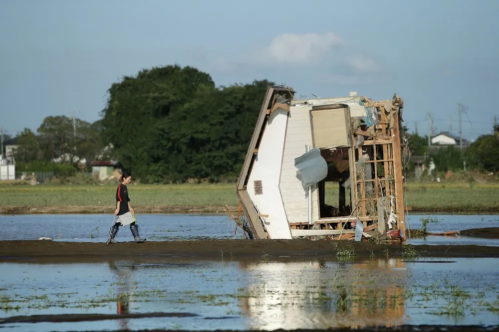 A woman walks towards a collapsed house on a field inundated by floodwaters in Joso in Ibaraki prefecture on September 11, 2015. Thousands of rescuers arrived in a deluged city north of Tokyo on September 11 to help evacuate hundreds of trapped residents and search for 12 people missing after torrential rains triggered massive flooding. (Photo by AFP Photo/JIJI Press)