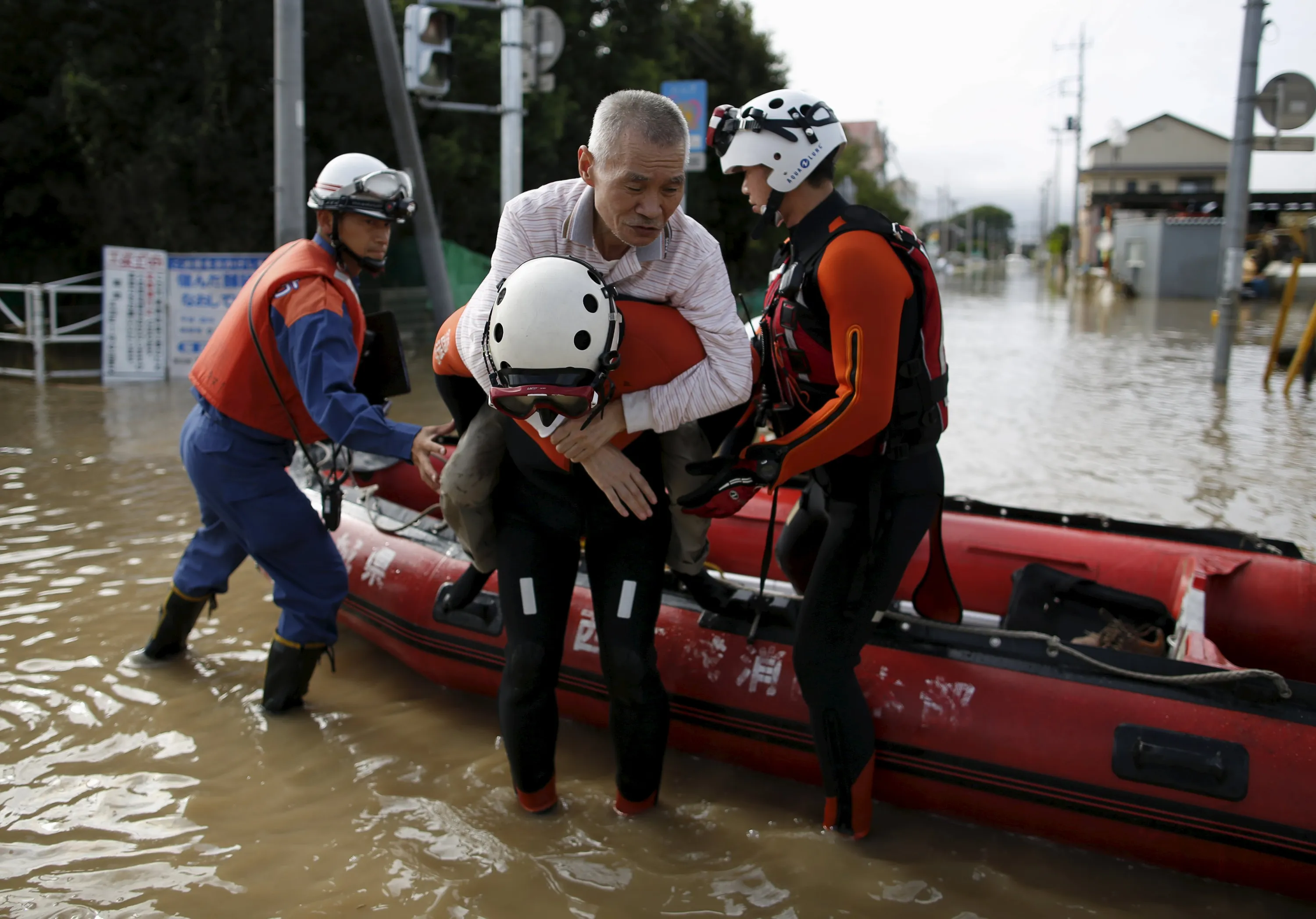 An elderly man is rescued by firefighters at a residential area flooded by the Kinugawa river, caused by typhoon Etau in Joso, Ibaraki prefecture, Japan, September 11, 2015. (Photo by Issei Kato/Reuters)