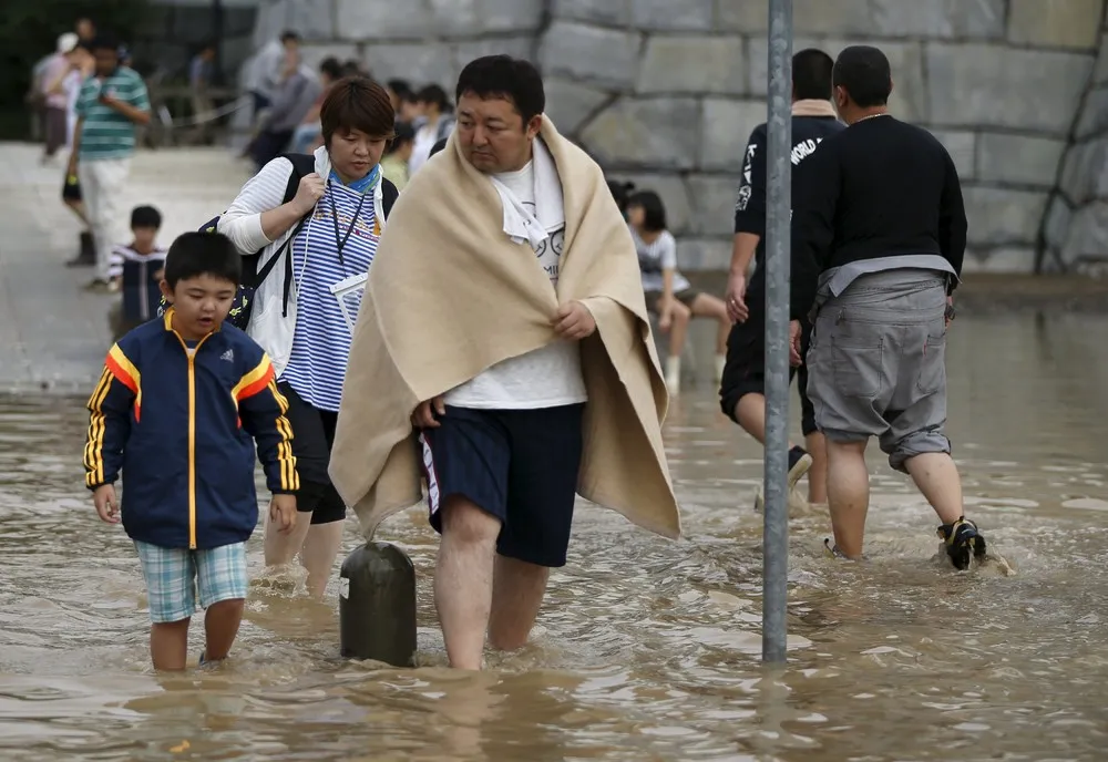 Local residents wade through a residential area flooded by the Kinugawa river, caused by typhoon Etau, in Joso, Ibaraki prefecture, Japan, September 11, 2015. (Photo by Issei Kato/Reuters)