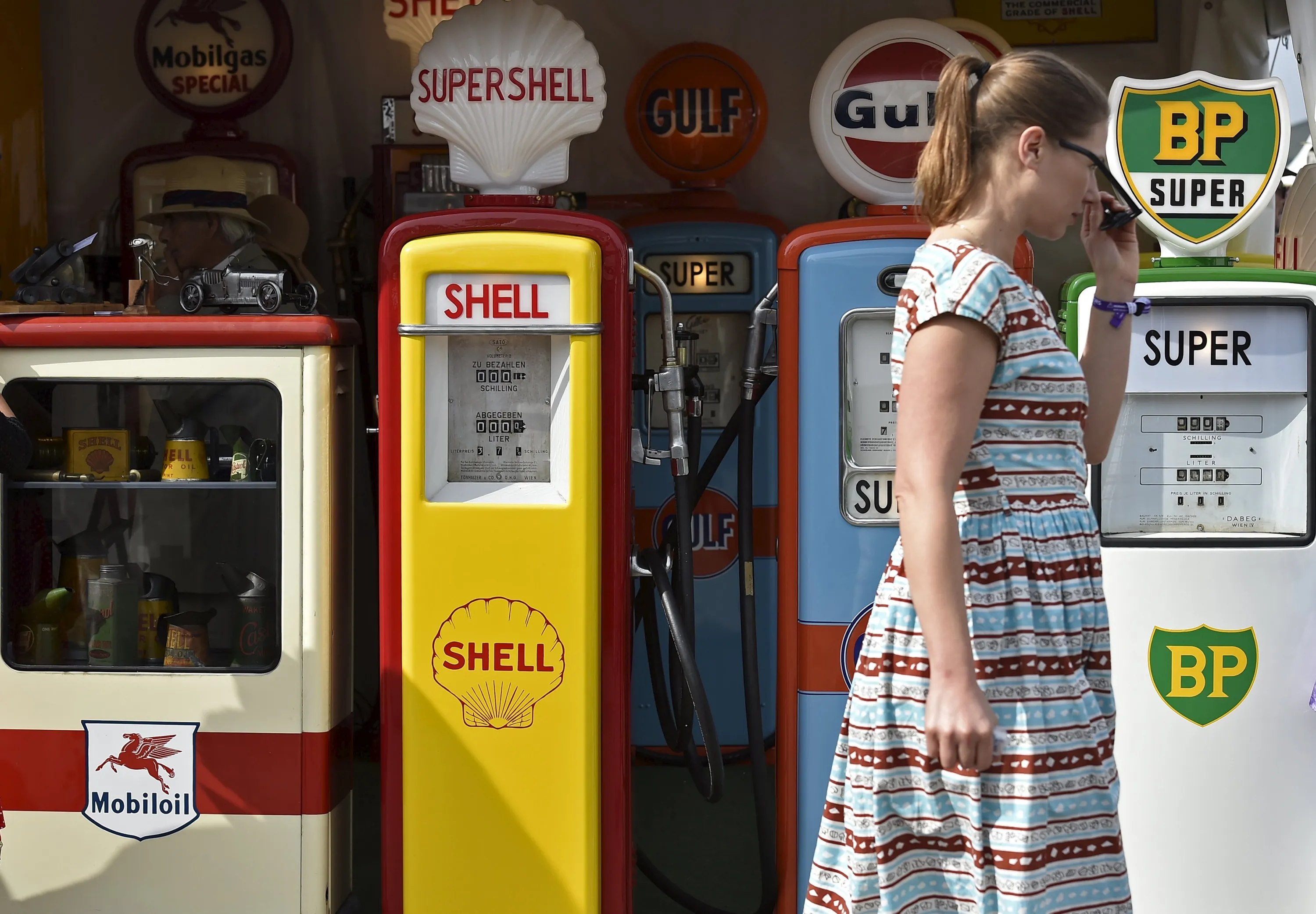 A woman passes vintage petrol pumps as visitors and car enthusiasts attend the Goodwood Revival historic motor racing festival in Goodwood, near Chichester in south England, Britain, September 11, 2015. (Photo by Toby Melville/Reuters)