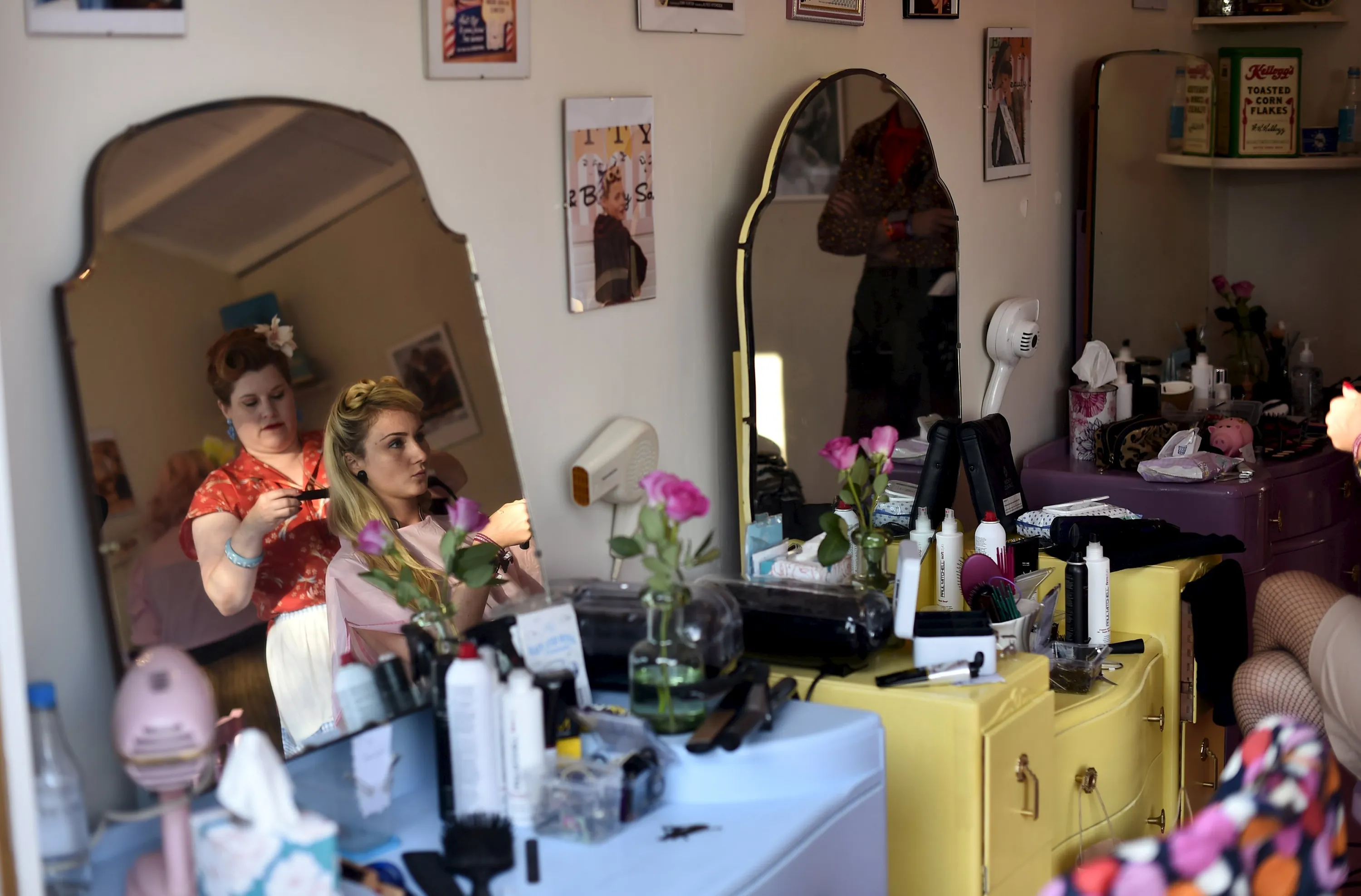 Visitors and car enthusiasts are seen in a hair salon at the Goodwood Revival historic motor racing festival in Goodwood, near Chichester in south England, Britain, September 11, 2015. (Photo by Toby Melville/Reuters)
