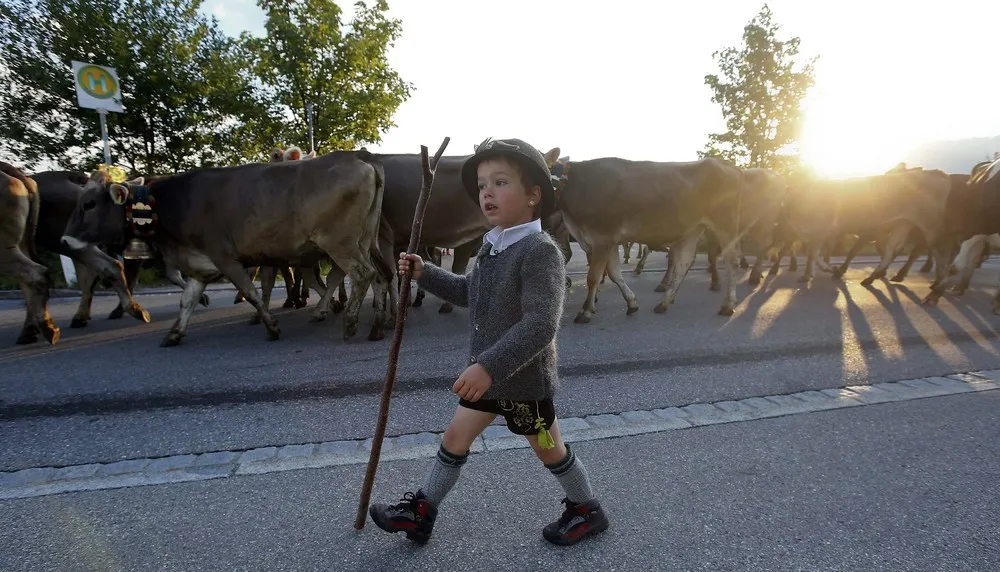 A Bavarian boy escorts cows during the traditional “Almabtrieb” in Oberstaufen, about 180km (110 miles) south of Munich, Germany, September 11, 2015. At the end of the summer season, farmers move their herds down from the Alps to the valley into winter pastures. (Photo by Michael Dalder/Reuters)