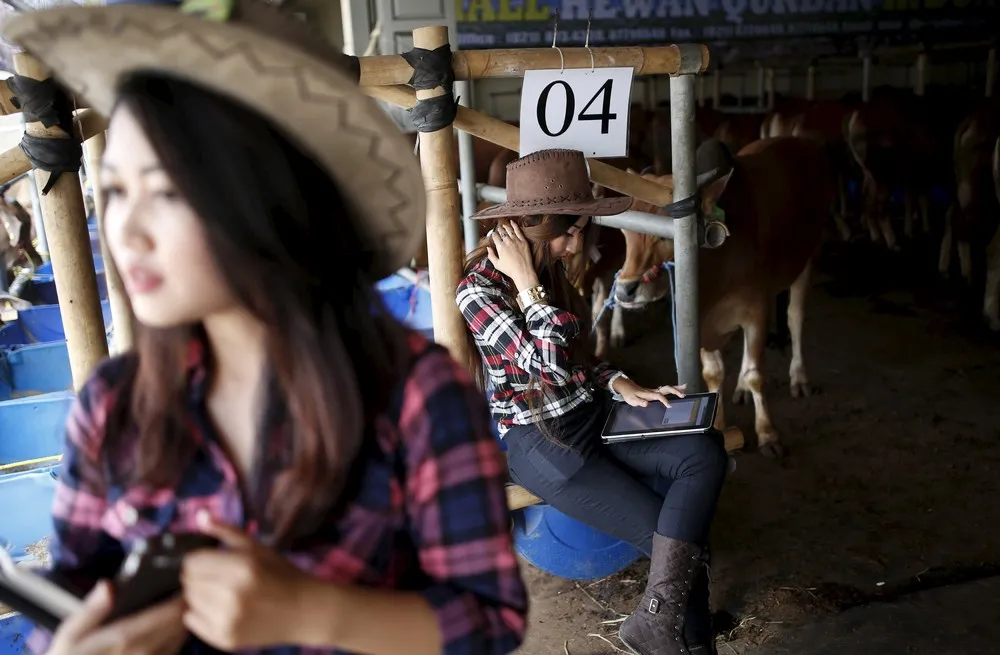 Sales women selling locally reared animals for the upcoming Muslim Eid al-Adha festival, wait for customers at a temporary cattle market in Depok, on the outskirts of Jakarta, Indonesia, September 11, 2015. Indonesia will seek to import cattle from a broader range of countries than at present, the chief economics minister said this week, as part of efforts to reduce the cost of beef, which has contributed to keeping inflation high. (Photo by Darren Whiteside/Reuters)