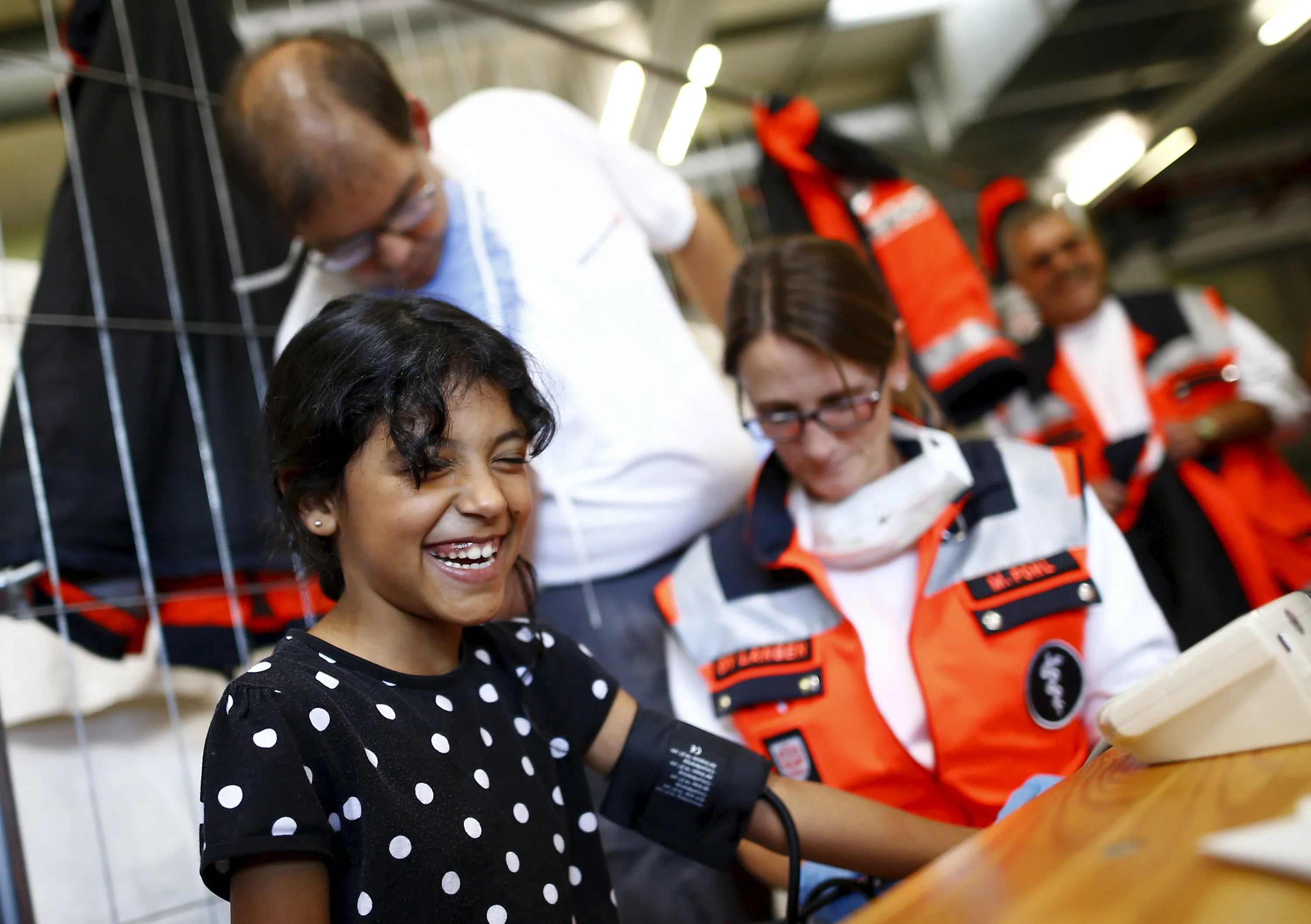 Shaima from Syria laughs as a doctor checks her blood pressure during her medical examination after her arrival in a former newspaper printing house used as a refugee registration centre for the German state of Hesse in Neu-Isenburg, on the outskirts of Frankfurt, Germany, September 11, 2015. About 700 people, mainly from Syria and Afghnaistan found shelter in the former printing area from Frankfurt newspaper Frankfurter Rundschau, according to officials at the centre. (Photo by Kai Pfaffenbach/Reuters)
