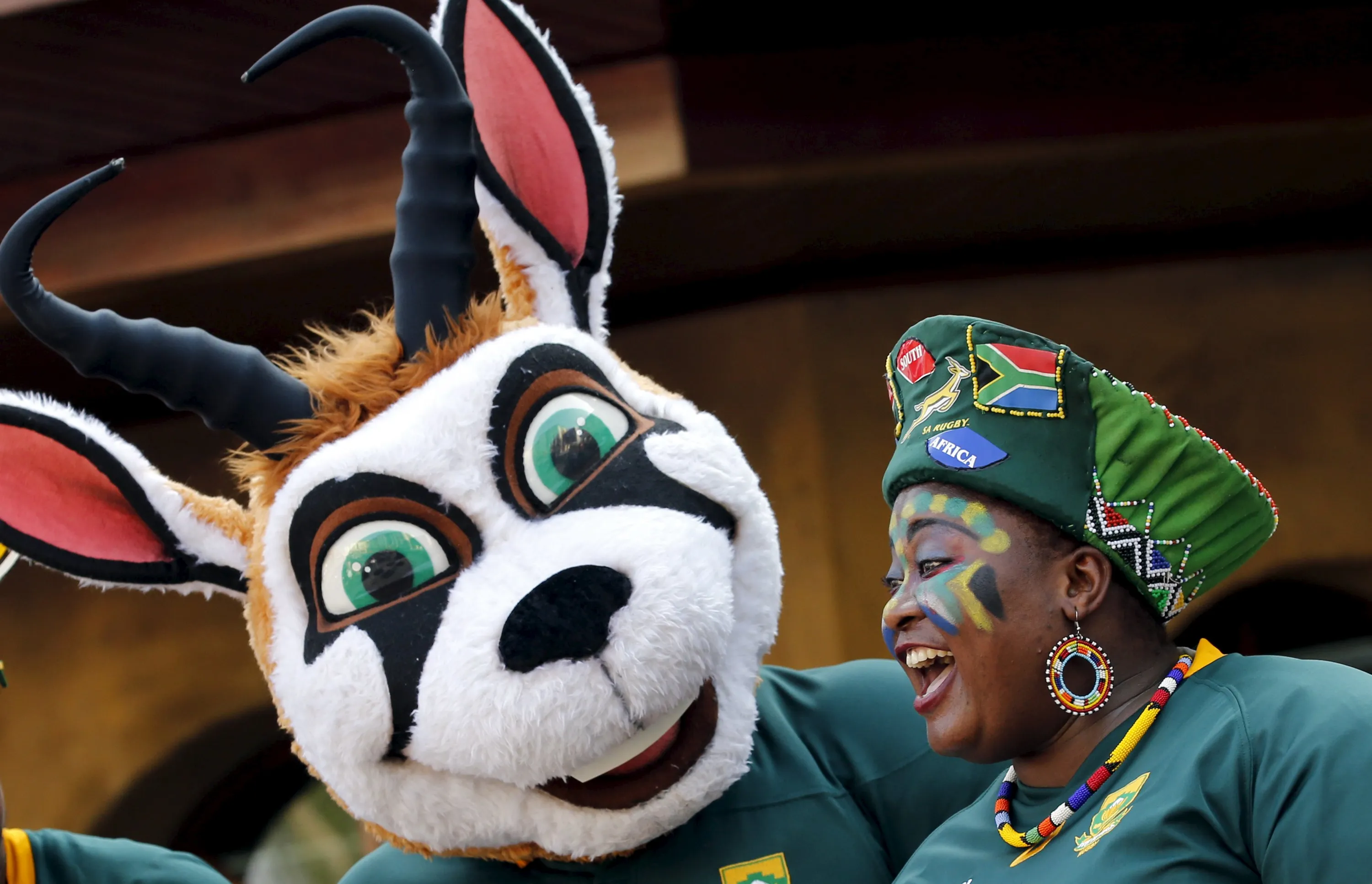 A rugby fan gestures next to a mascot during a public farewell for South Africa's rugby team, ahead of their departure for the World Cup in England, in Johannesburg September 11, 2015. South Africa Rugby Union president Oregan Hoskins has defended his administration's record in providing opportunities to non-white players at the highest level and urged the country to get behind the team for the World Cup. (Photo by Siphiwe Sibeko/Reuters)