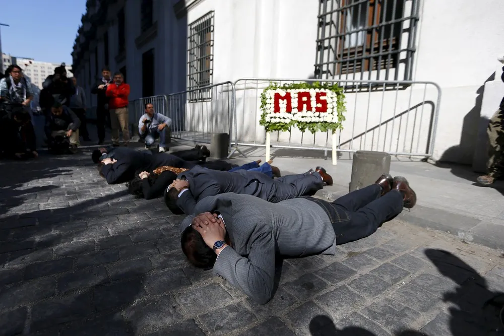 Activists perform as the people who were detained during the coup d'etat led by former dictator Augusto Pinochet next to the “La Moneda” Presidential Palace during a rally in Santiago September 11, 2015. Friday marked the 42nd anniversary of the coup d'etat in Chile that ushered in a 17-year dictatorship under Pinochet. (Photo by Ivan Alvarado/Reuters)