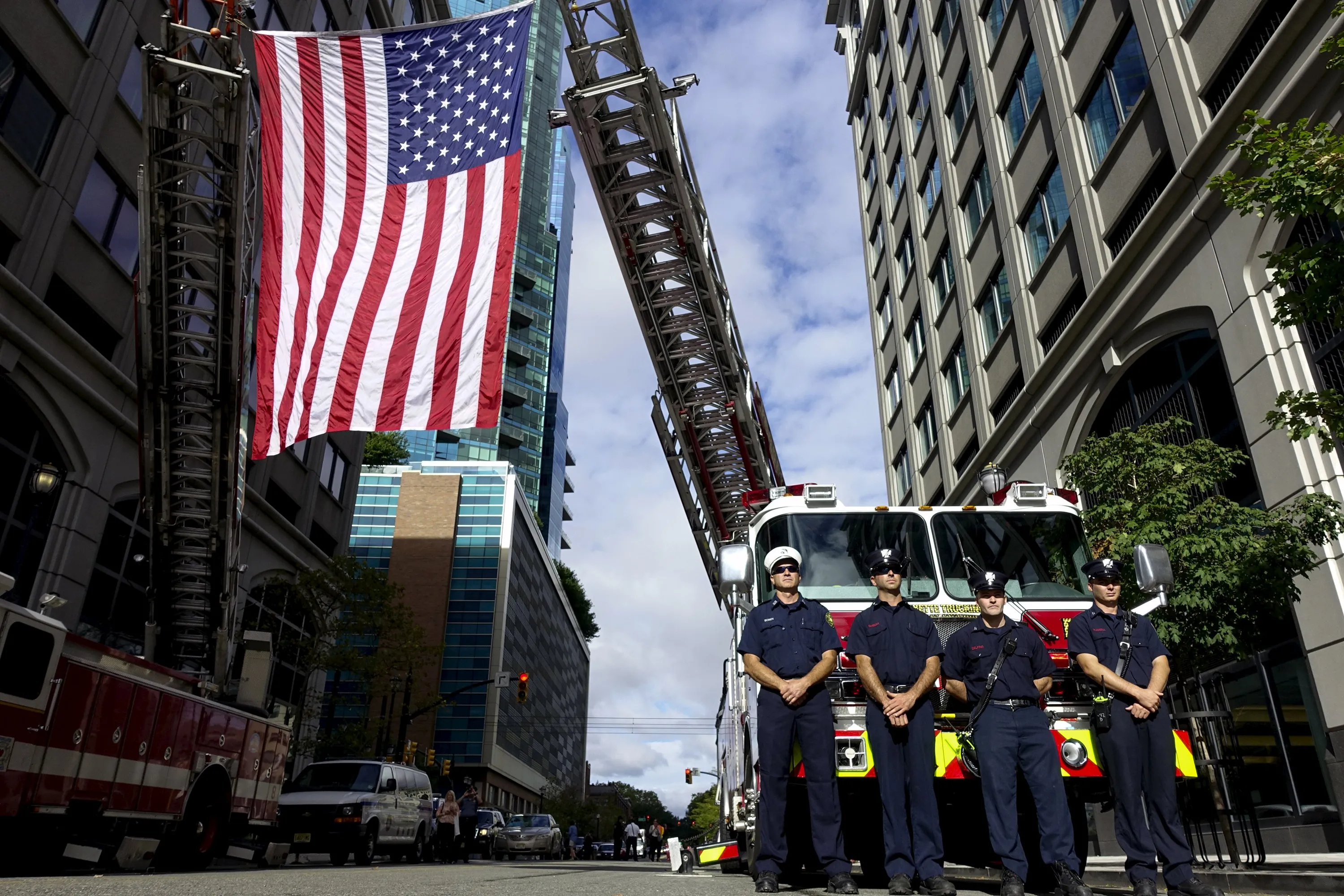 Jersey City Fire Department members attend a ceremony for 9/11 victims at a memorial across from New York's Lower Manhattan and One World Trade Center in Exchange Place, New Jersey September 11, 2015. (Photo by Eduardo Munoz/Reuters)