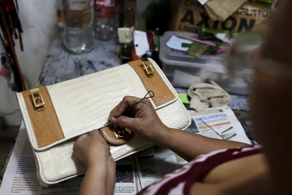 A woman works on a handbag made from crocodile skin, inside a sewing workshop at Panagator, a sustainable crocodile farm, on the outskirts of Panama City September 11, 2015. (Photo by Carlos Jasso/Reuters)