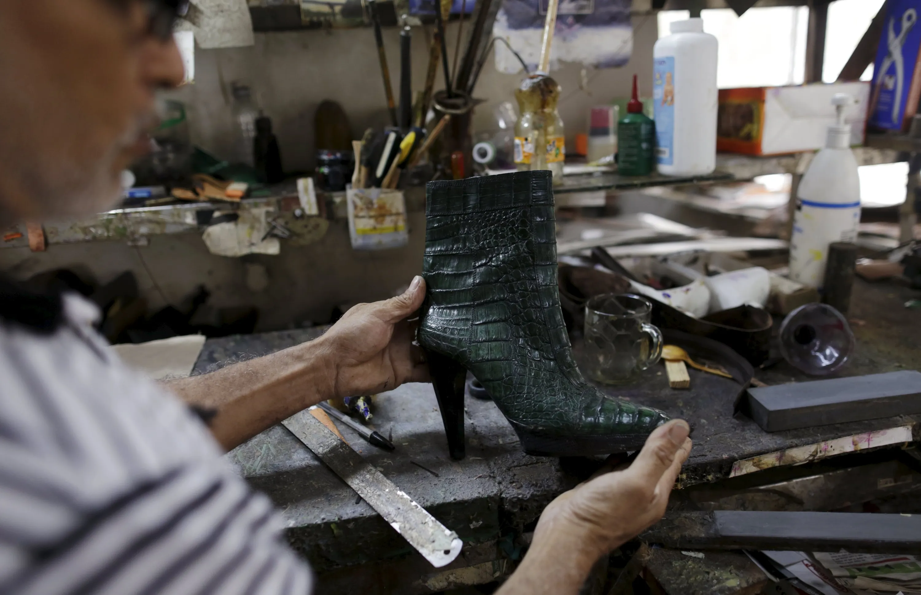 A man holds a boot made from crocodile skin, inside a sewing workshop at Panagator, a sustainable crocodile farm, on the outskirts of Panama City September 11, 2015. (Photo by Carlos Jasso/Reuters)
