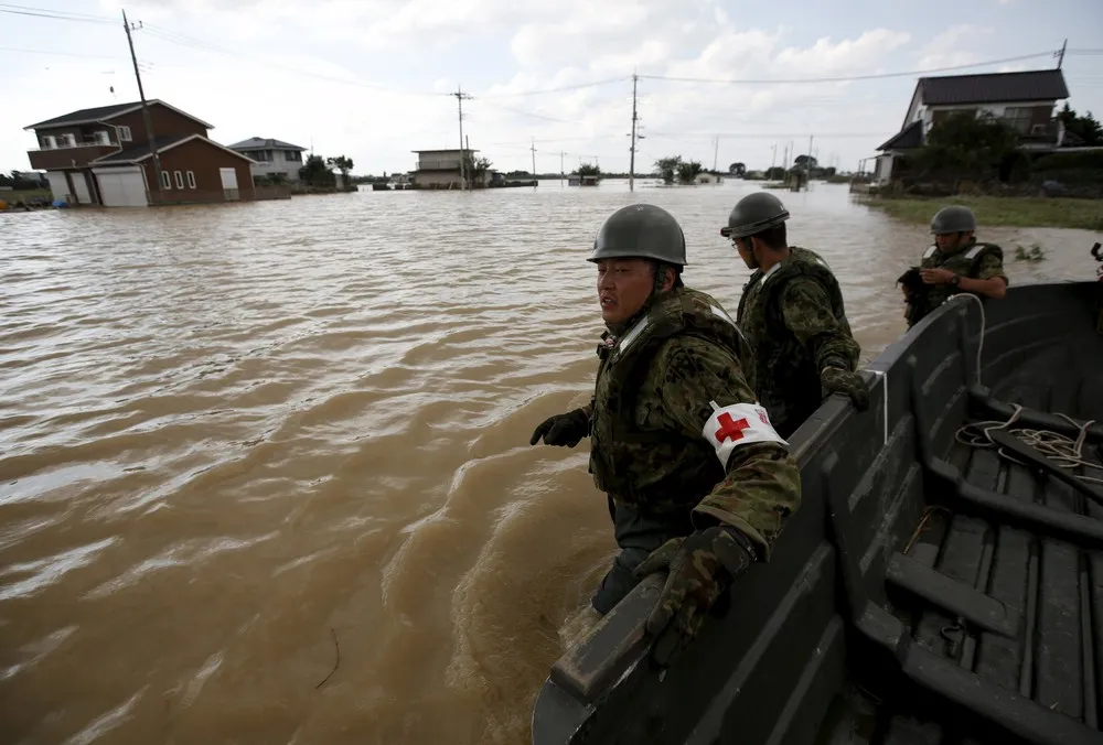 Japanese Self-Defence Force's 1st Infantry Regiment soldiers conduct a search and rescue operation at a residential area flooded by the Kinugawa river, caused by Typhoon Etau at Araigi town in Joso, Ibaraki prefecture, Japan, September 12, 2015. Search teams using boats and helicopters resumed looking on Saturday for at least 16 people still missing after torrential rain and flooding across Japan this week, while thousands waited to return to their homes as waters slowly receded. (Photo by Issei Kato/Reuters)