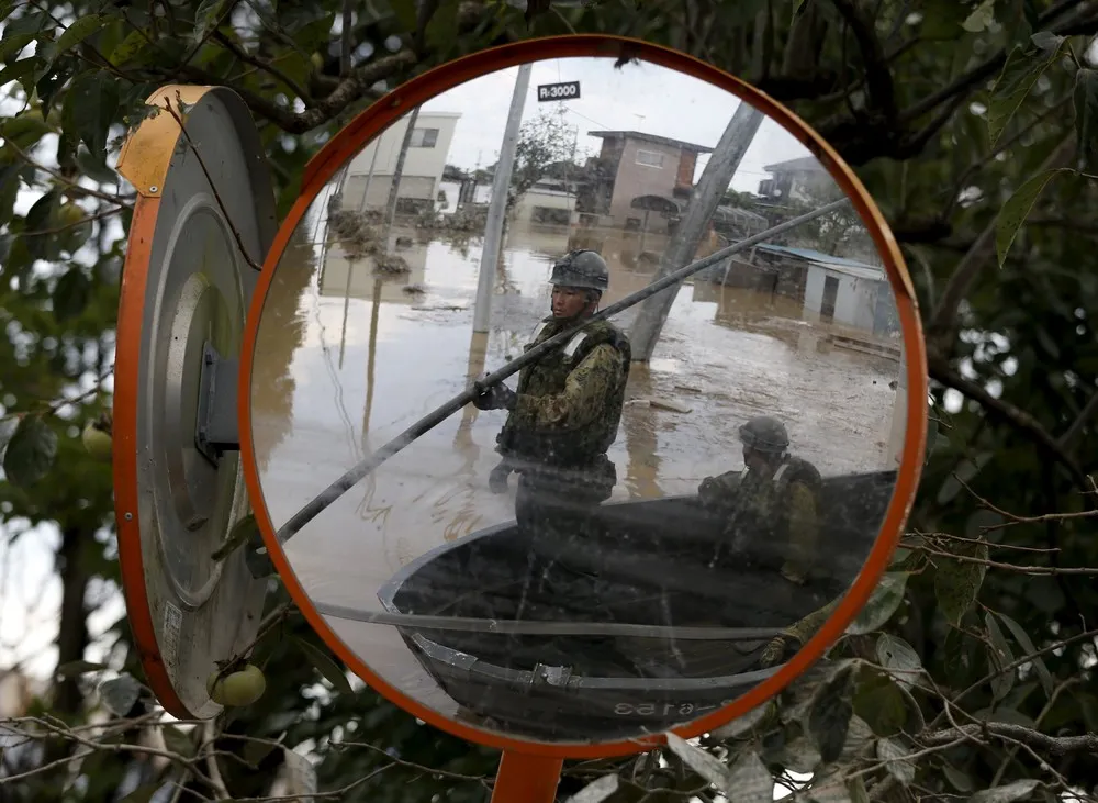 Japanese Self-Defence Force's 1st Infantry Regiment soldiers is seen on a boat are reflected on a traffic mirror as they conduct a search and rescue operation at a residential area flooded by the Kinugawa river, caused by Typhoon Etau at Araigi town in Joso, Ibaraki prefecture, Japan, September 12, 2015. (Photo by Issei Kato/Reuters)