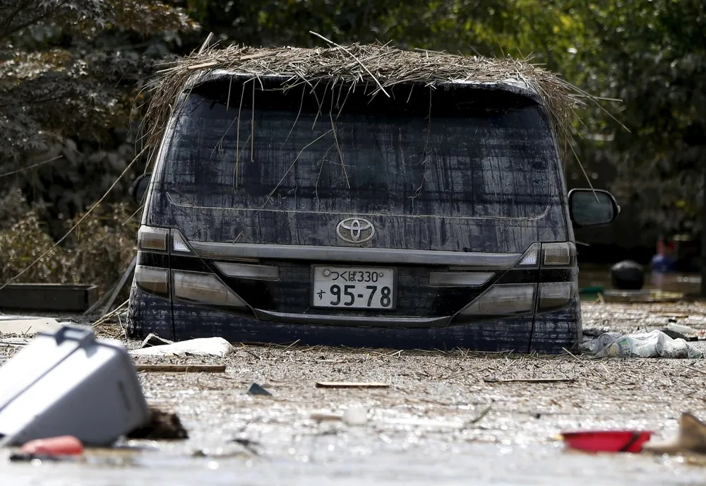 A damaged Toyota Motor car is seen at a residential area flooded by the Kinugawa river, caused by Typhoon Etau at Araigi town in Joso, Ibaraki prefecture, Japan, September 12, 2015. (Photo by Issei Kato/Reuters)