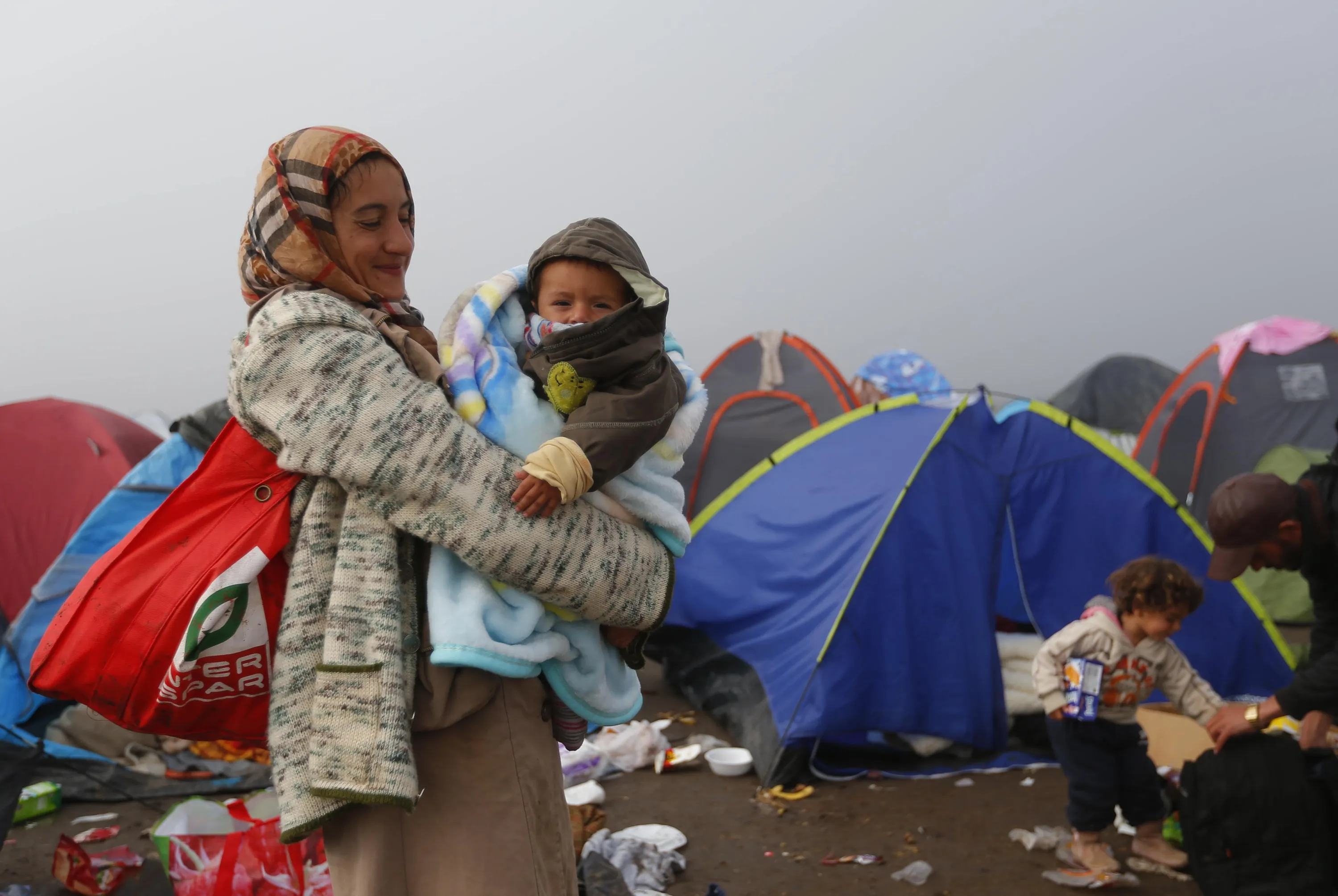 A woman carries her baby at a migrant collection point in Roszke, Hungary September 12, 2015. (Photo by Laszlo Balogh/Reuters)