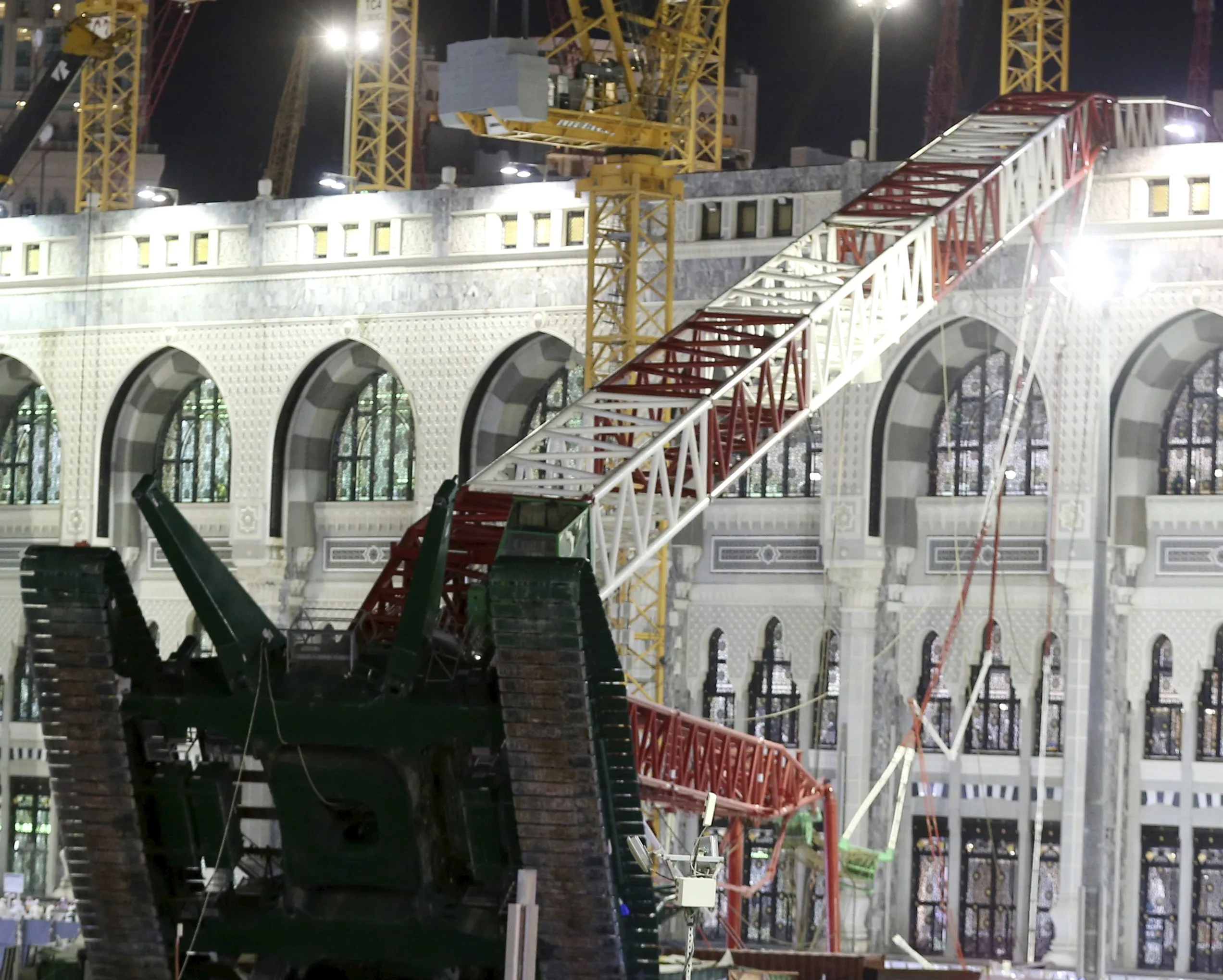 Saudi emergency crew stand near a construction crane after it crashed in the Grand Mosque in the Muslim holy city of Mecca, Saudi Arabia September 11, 2015. At least 107 people were killed when the crane toppled over at Mecca's Grand Mosque on Friday, Saudi Arabia's Civil Defence authority said, less than two weeks before Islam's annual haj pilgrimage. (Photo by Reuters/Stringer)