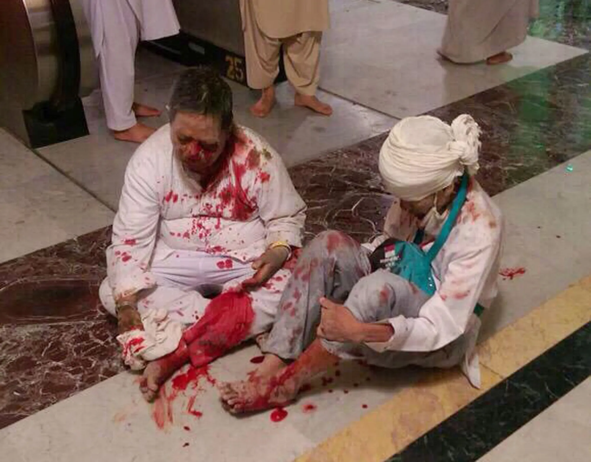 Wounded pilgrims sit on the floor after a crane collapse that killed dozens inside the Grand Mosque in Mecca, Saudi Arabia, Friday, September 11, 2015. The accident happened as pilgrims from around the world converged on the city, Islam's holiest site, for the annual Hajj pilgrimage, which takes place this month. (Photo by AP Photo)