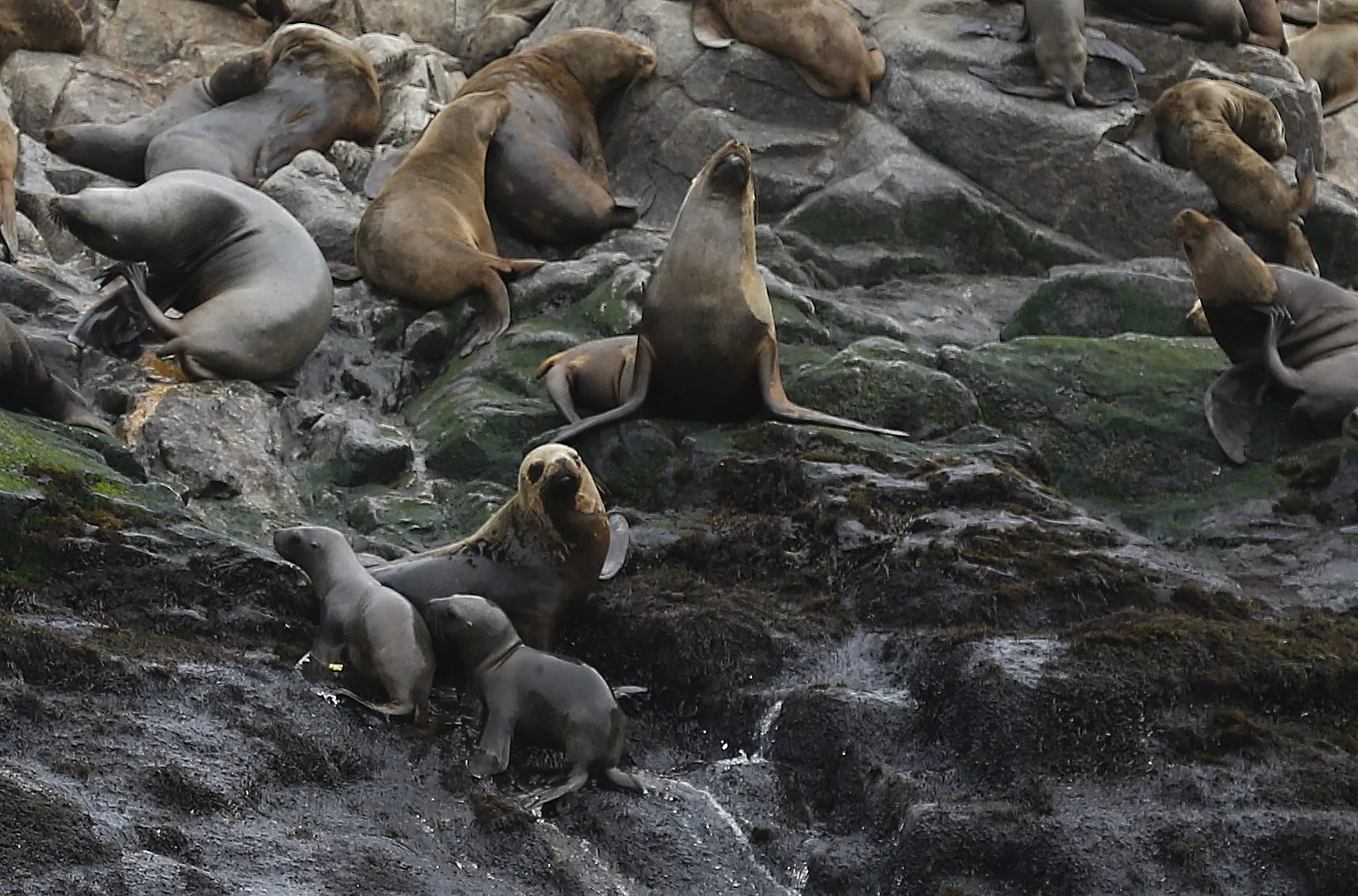 Two of the newly released sea lions (L) climb the rocks next to a sea lion colony at Palomino island, in Callao, Peru September 12, 2015. (Photo by Mariana Bazo/Reuters)