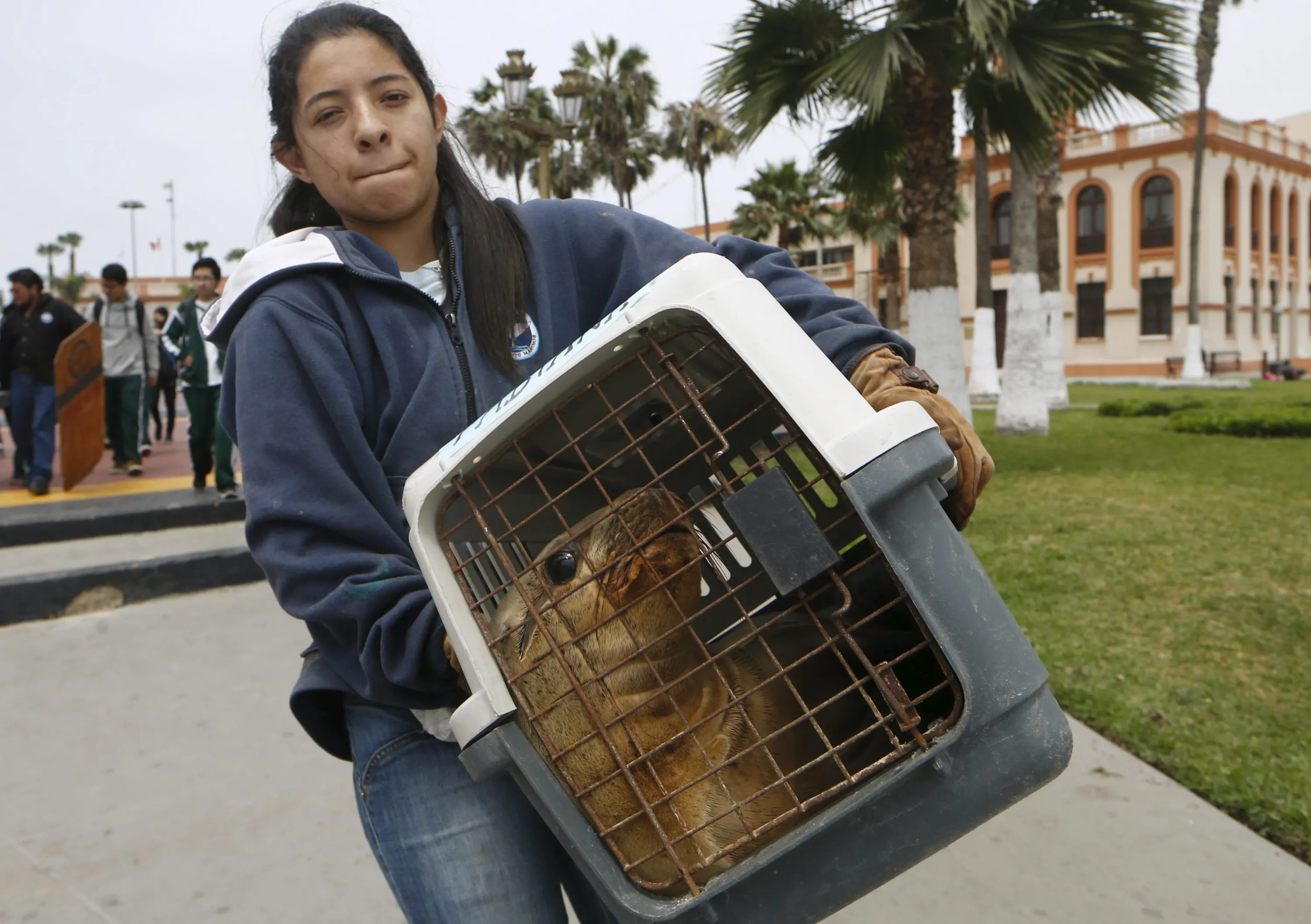 A volunteer of Animal Science and Well-being Organization (ORCA), carries sea lion, Fabiana, in a cage onto a boat in Callao, Peru, September 12, 2015. Four young sea lions returned to the wild after being rescued by marine biologists and treated for various illnesses. The sea lions are survivors of various illnesses which they contracted off the coast of Peru caused by the elevated temperatures in the water because of the El Nino phenomenon, according to Carlos Yaipen, Director of Animal Science and Well-being Organization (ORCA). (Photo by Mariana Bazo/Reuters)