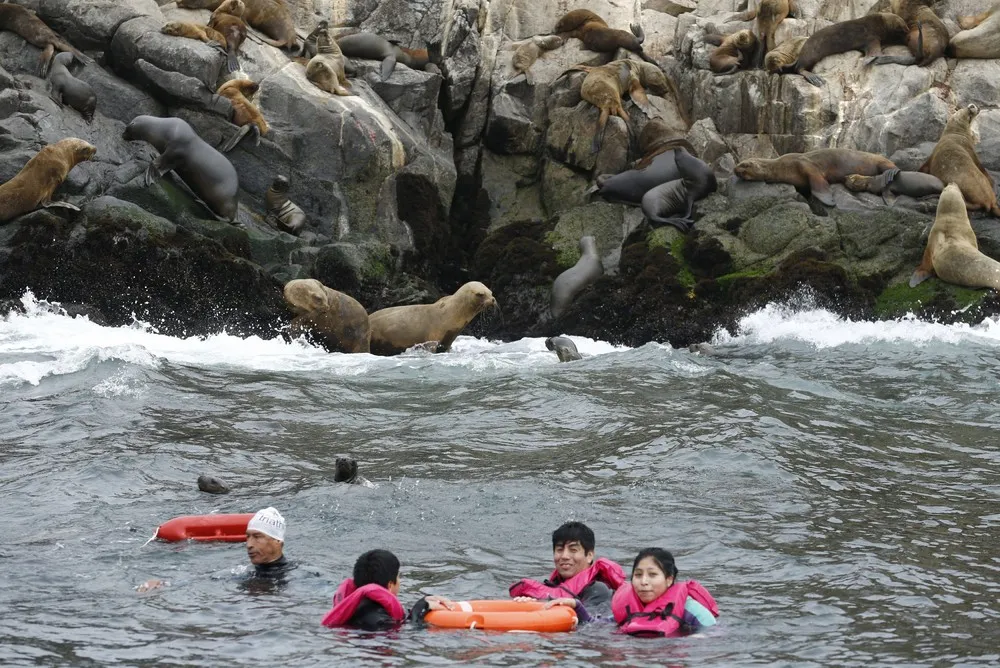 Tourists swim near a colony of sea lions in front of the Palomino island in Callao, Peru, September 12, 2015. (Photo by Mariana Bazo/Reuters)